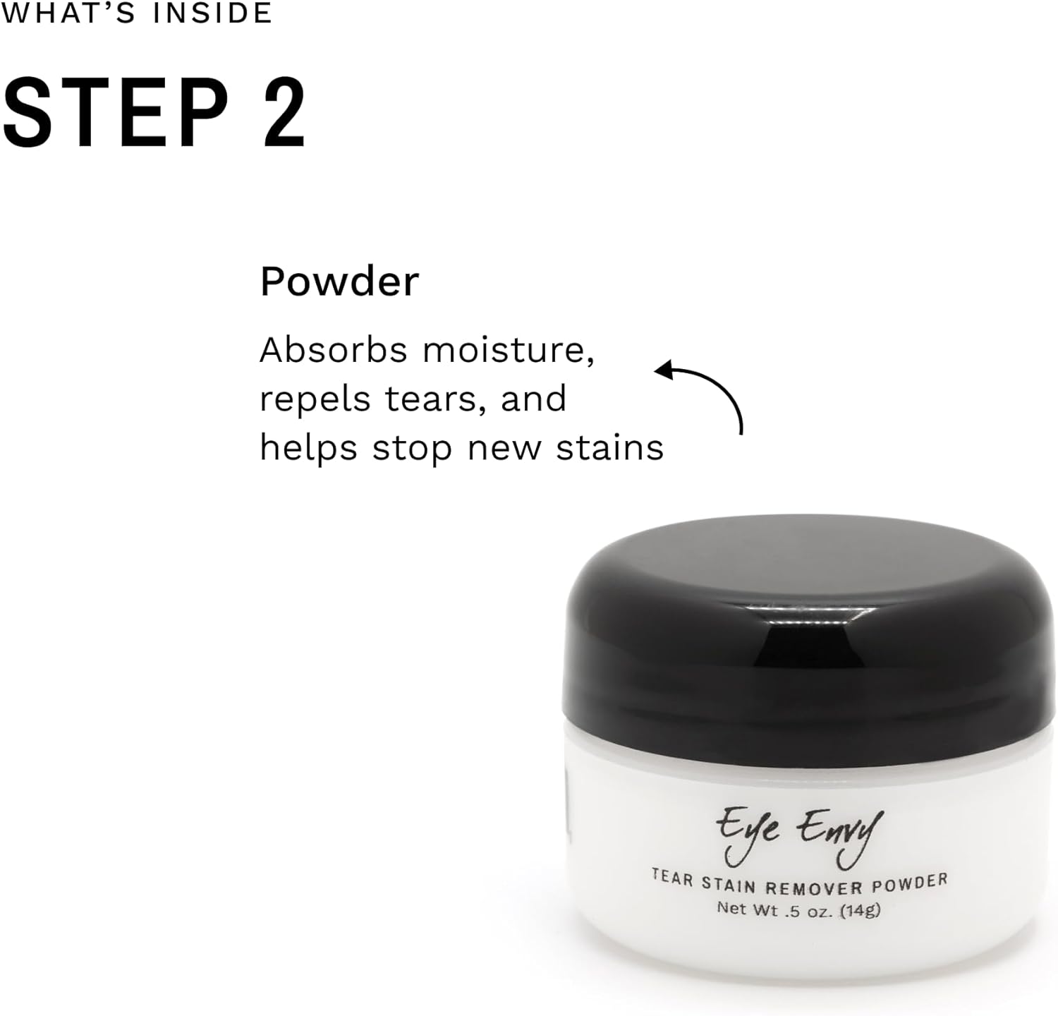 - TWO-STEP SYSTEM: Tear Stain Solution cleans the affected area and helps fight the root cause of the staining; apply with included applicator pads. Tear Stain Powder absorbs excess moisture and helps repel new tears. It is NOT a chalk or cover up, but a natural silk-like powder that safely keeps your pet’s eye dry, stain-free and full of luster.