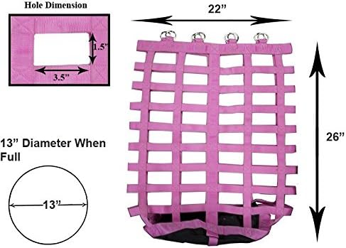 - HOLDS 2-3 FLAKES OF HAY - this 13x13x26" hay bag with 3.5x1.5" rectangular openings holds approx. 2-3 flakes of Timothy, Orchard, Alfalfa, or any other type of hay. Our hay bags were designed to minimize frustration and can be stuffed in seconds.