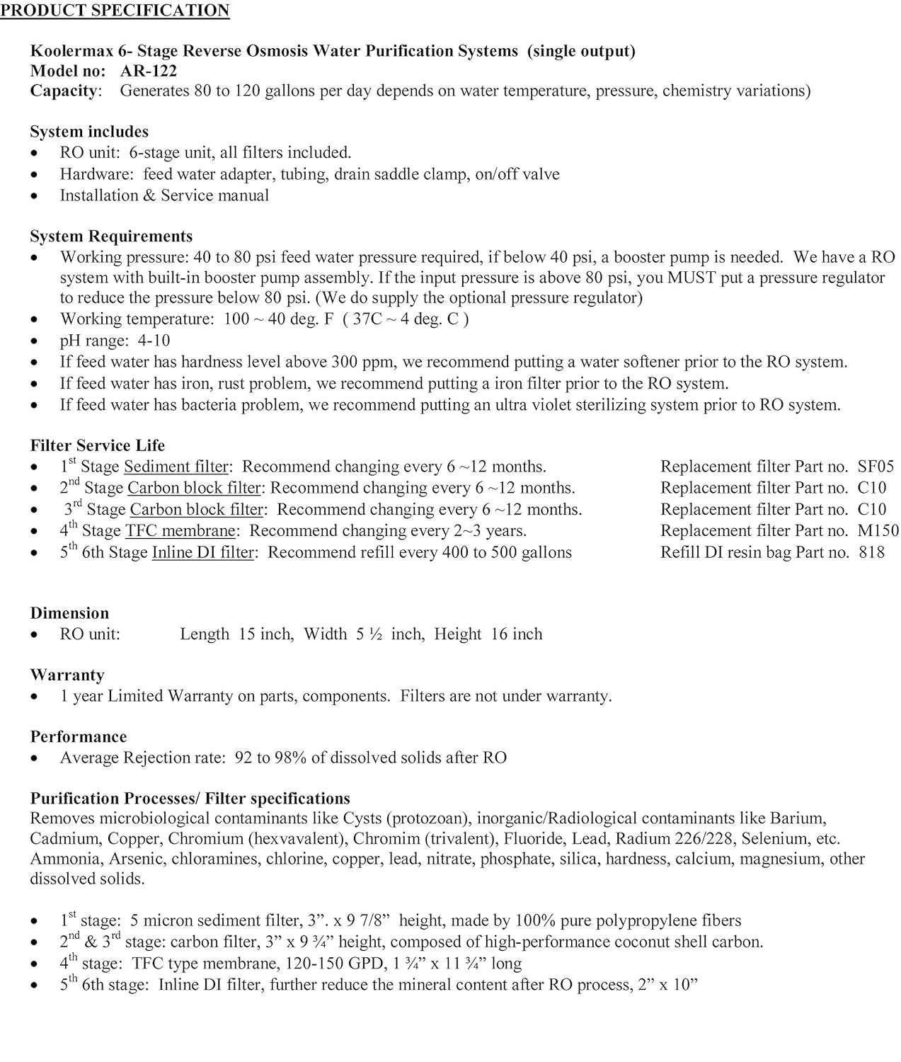 - 1st stage sediment filter, 2nd & 3rd stage carbon filter, 4th stage TFC-150 RO membrane, 5th & 6th stage color changing DI filters