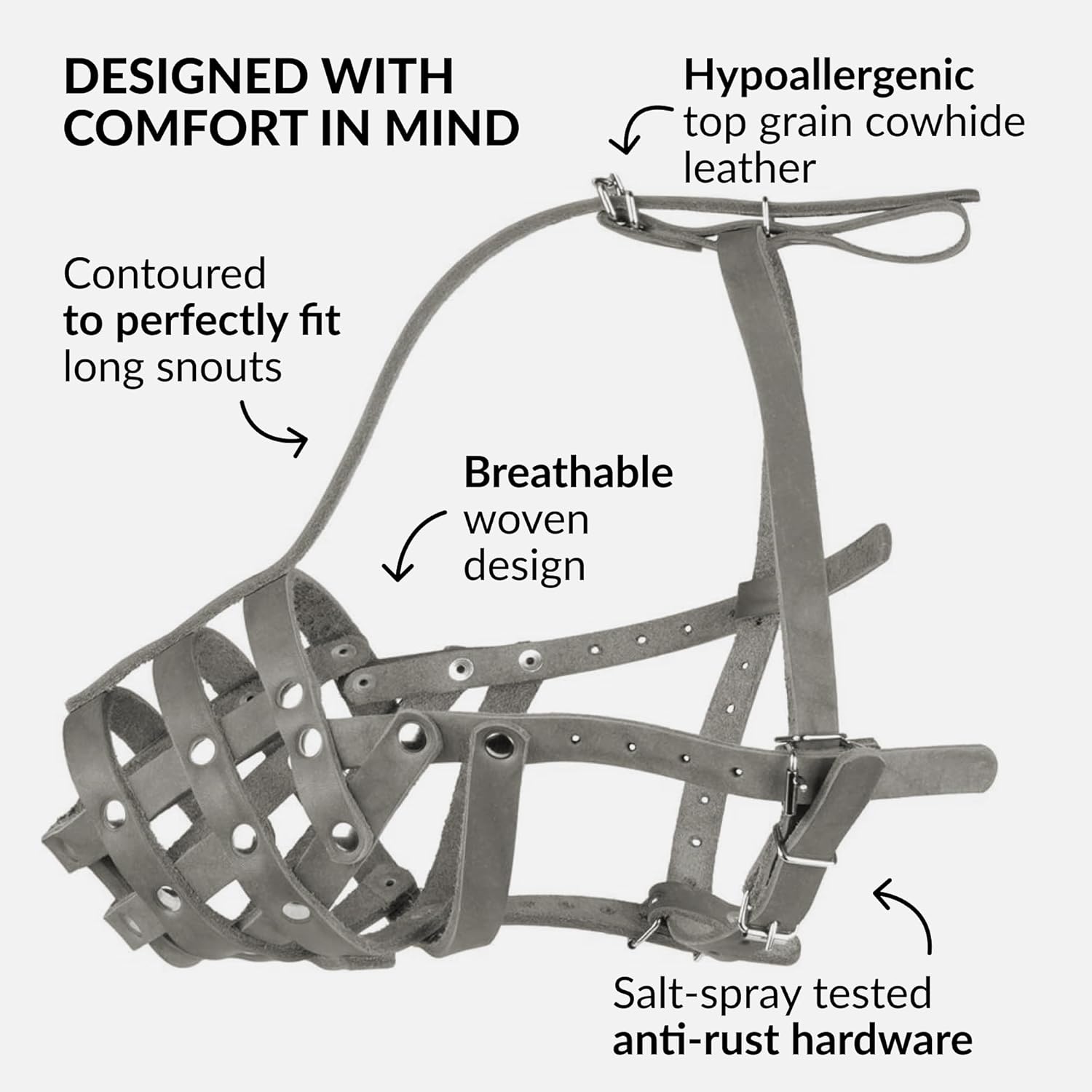 - COMFORTABLE: Our high-quality, handmade leather dog muzzle is skin-friendly. With a cross-weave design, this breathable, durable muzzle is soft on your dog’s fur because your pet’s comfort always comes first.