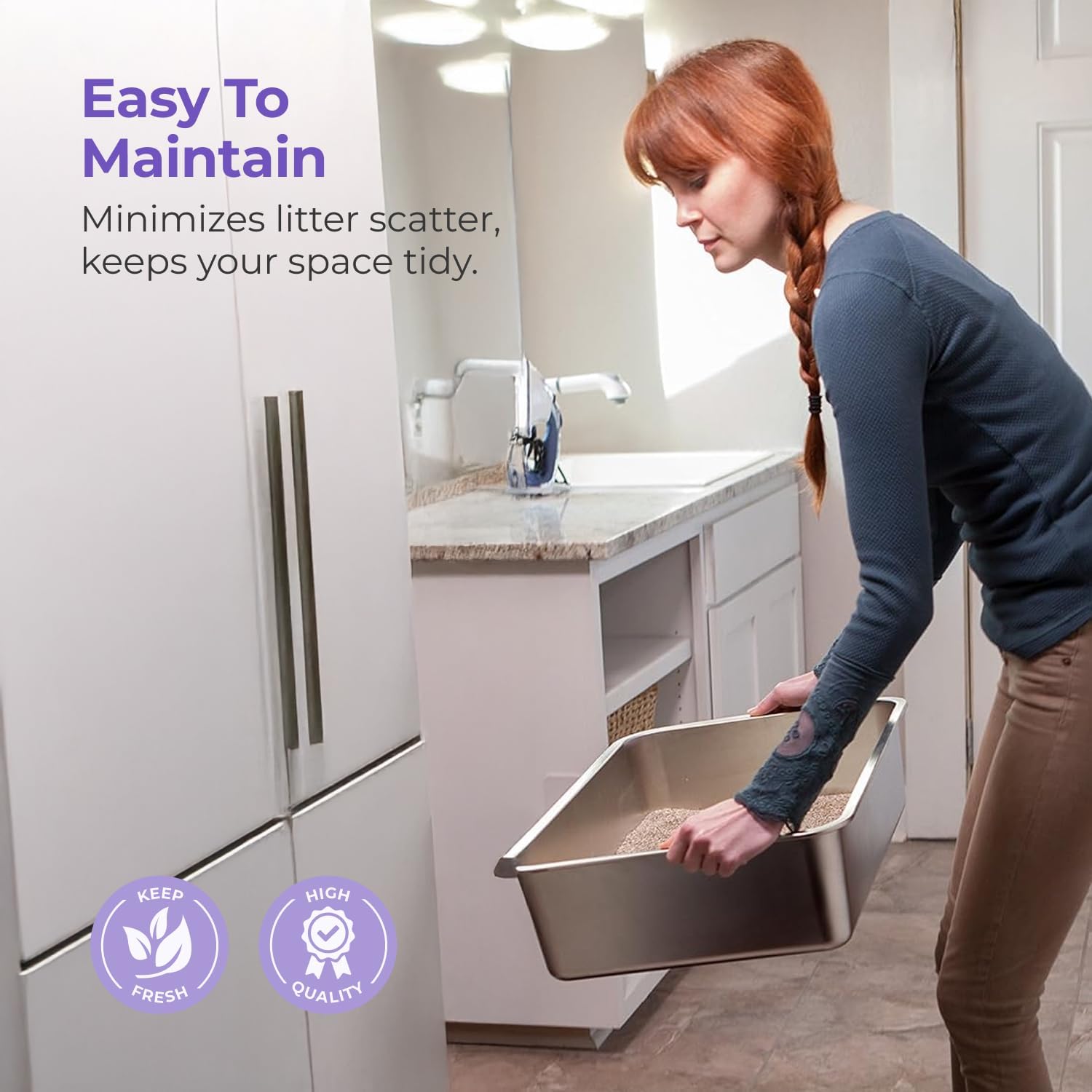 - STAINLESS STEEL & ERGONOMIC STRUCTURE - Crafted from rust-resistant stainless steel, our cat XL litter box ensures unrivaled durability. With an ergonomic design featuring rounded edges and enclosed sides, nothing will get stuck in hard-to-reach corners.