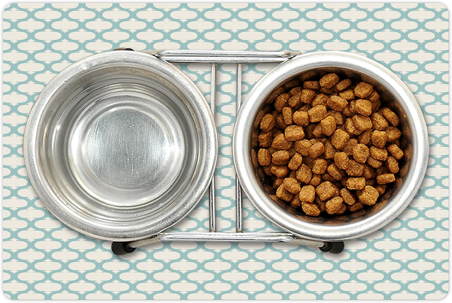 Lunarable Ikat Pet Mat for Food and Water, Mesh Patterns and Lines on Vintage Backdrop Retro Ikat Style Boho Print, Non-Slip Rubber Mat for Dogs and Cats, 18" X 12", Turquoise Cream