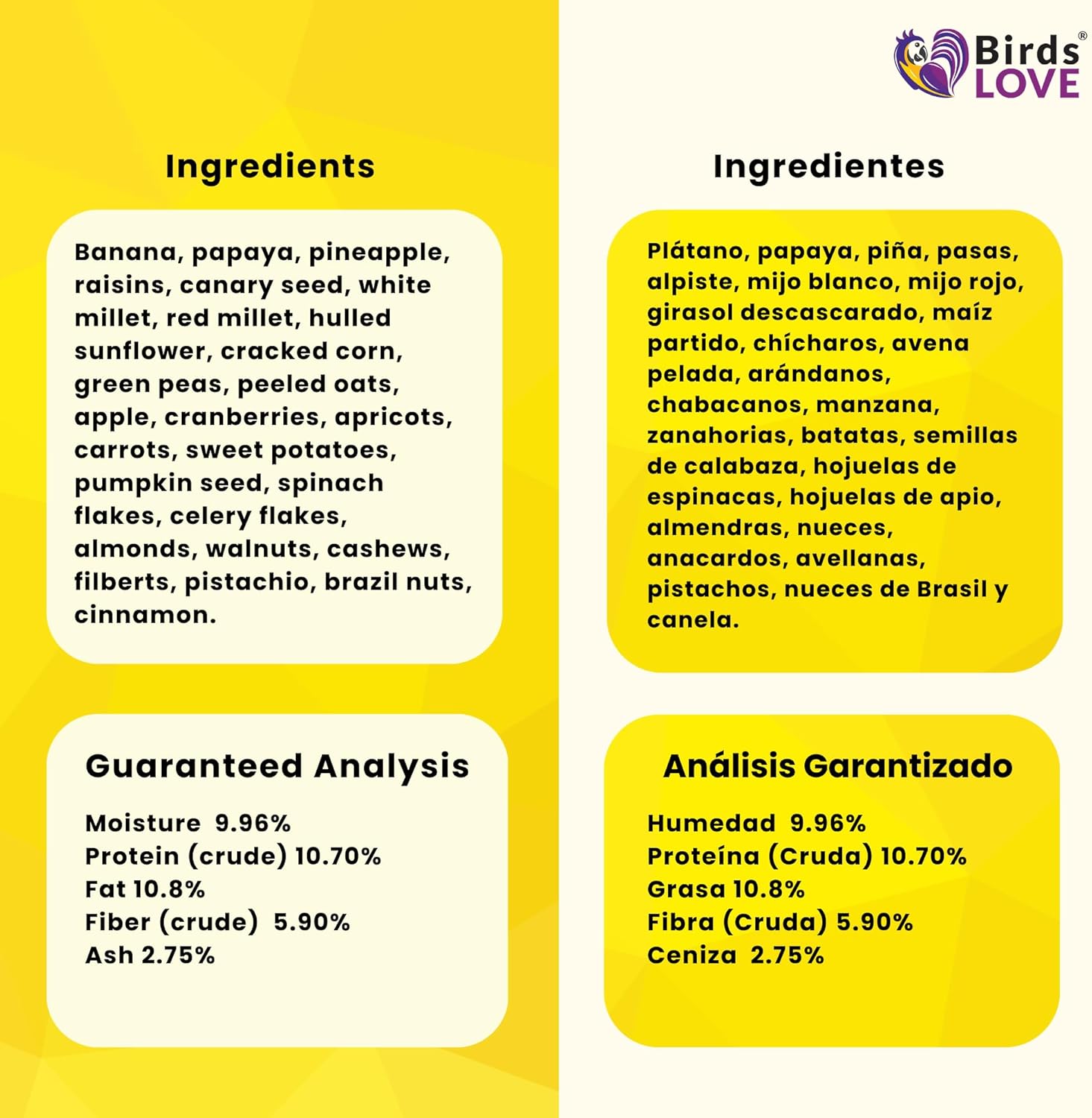- No added preservatives nor sweeteners: natural sweet fruits to maintain healthy skin, muscles, and feathers