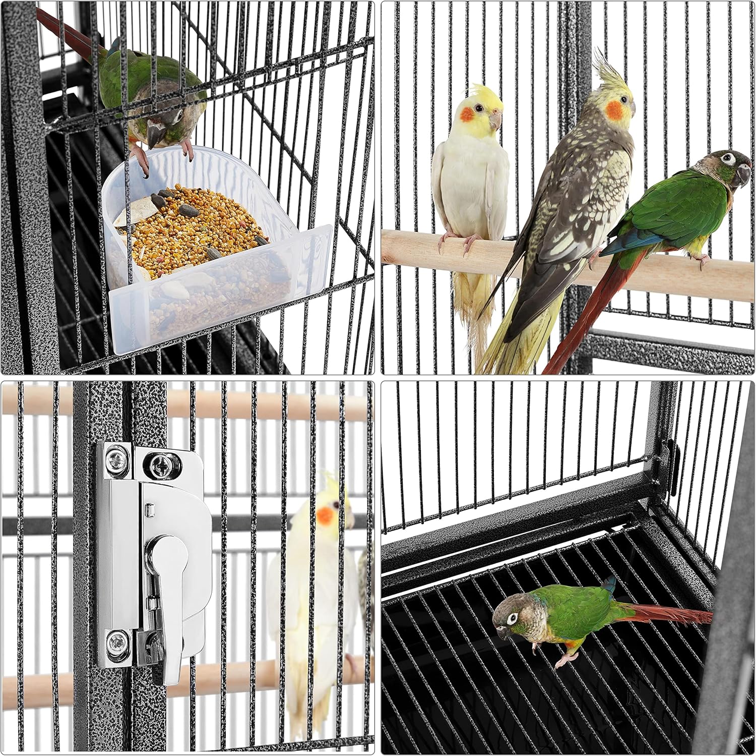 - Pet-parent friendly designs: The cage features an extra storage shelf on the stand to keep pets' accessories and feed handy and neat. Four feeder doors on the wall allow for convenient feed refilling. You can access the feeders from outside without scaring your bird
