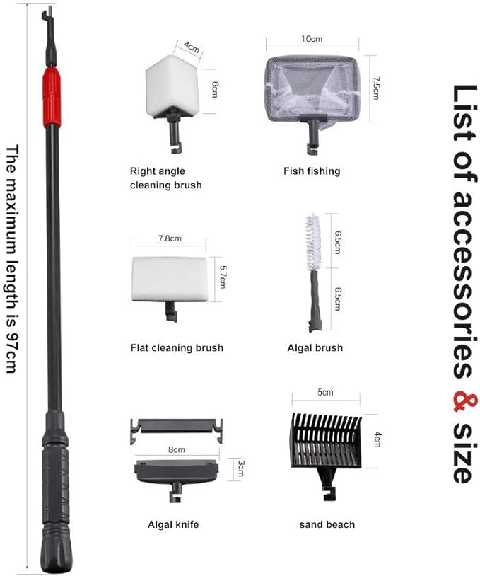 - *Aquarium Cleaning Tool 6 in 1** Aquarium cleaning tools including Scraper,Gravel Rake, Brush,Cleaning Sponge,Fishing Net,and right- angle Cleaning Sponge