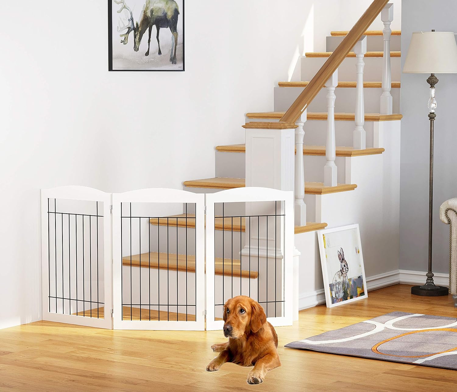 - EASY TO SET UP & STORE: The Dog Gate Quickly Unfolds Like an Accordion, Making It Simple to Set Up and Store. Consists of 3 pet panels, connected and secured together with sturdy 360 degree hinges for multiple configurations
