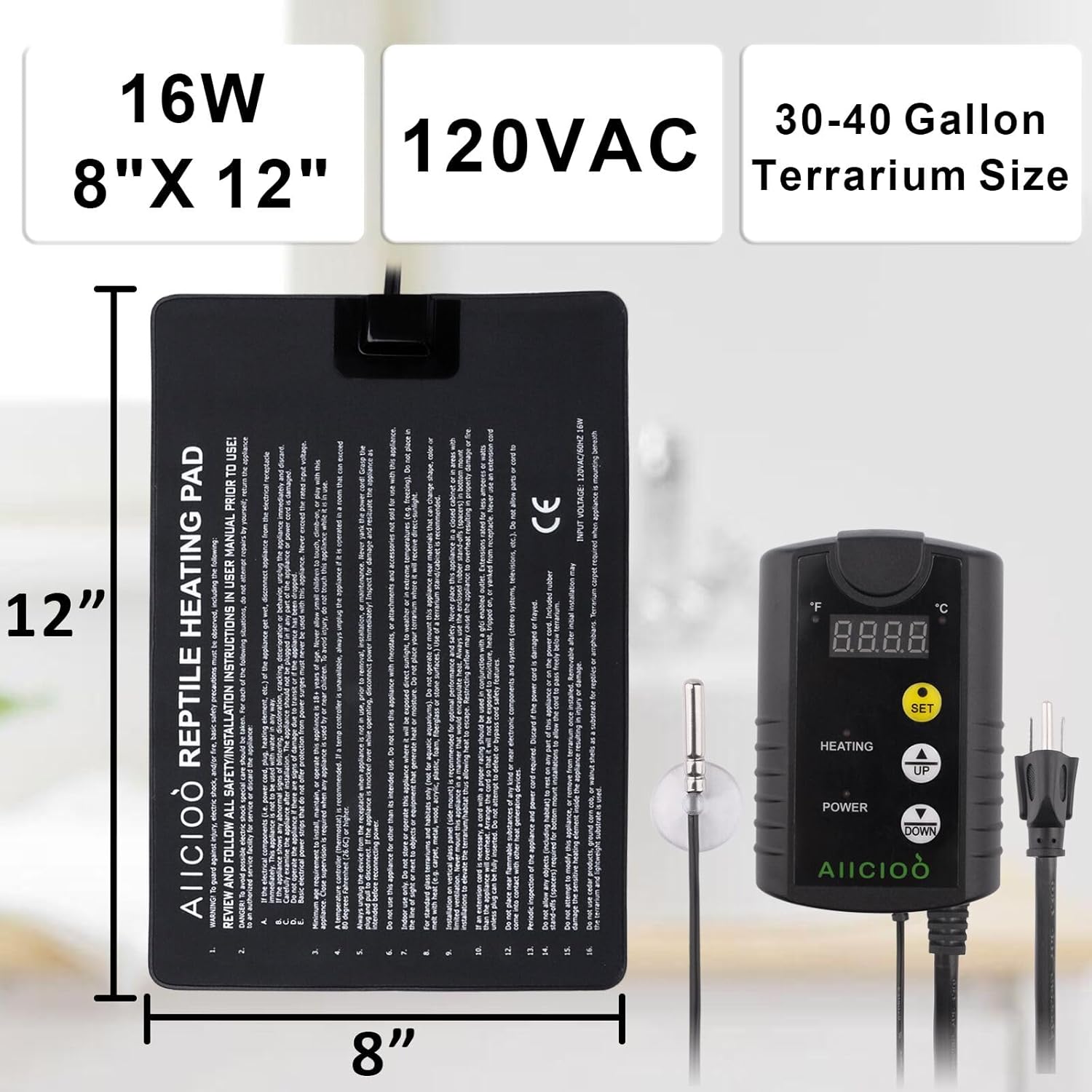 Aiicioo Under Tank Heater Thermostat - Reptile Heating Pad with Temperature Control Reptile Heat Mat for Combo Set for Hermit Crab Lizard Terrarium 16W