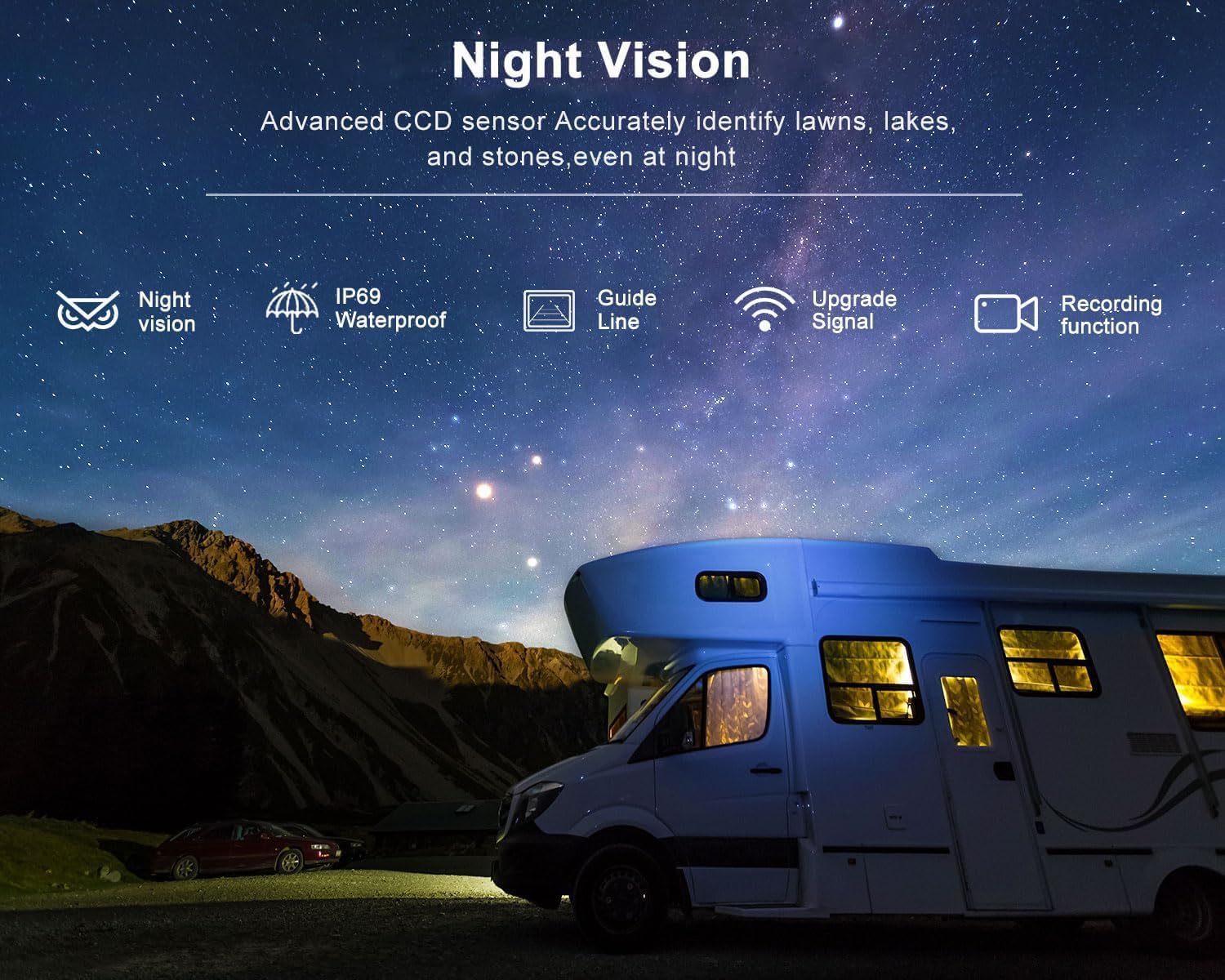 - 🌙【Night Vision & IP69 Waterproof】 Infrared LEDs + CCD sensor detect obstacles in darkness (lawns, curbs, debris) *Clean camera lens periodically for optimal night vision. The IP69-rated metal-sealed housing resists rain, snow, dust, and extreme temps (-4°F to 158°F), provide you all day intimate monitoring.