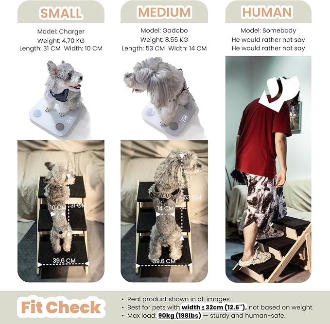 - 5. Size & Weight Capacity Step:15.6" L x 9.3" W x 6.1" H in 4-step full open: 31.5" L x 17.2" W x 25.0" H in. Folded: 39.3" L x 17.2" W x 3.15" in Max load: 100kg / 220lbs. Designed for small and medium dogs and cats with waist width ≤32cm / 12.6in.