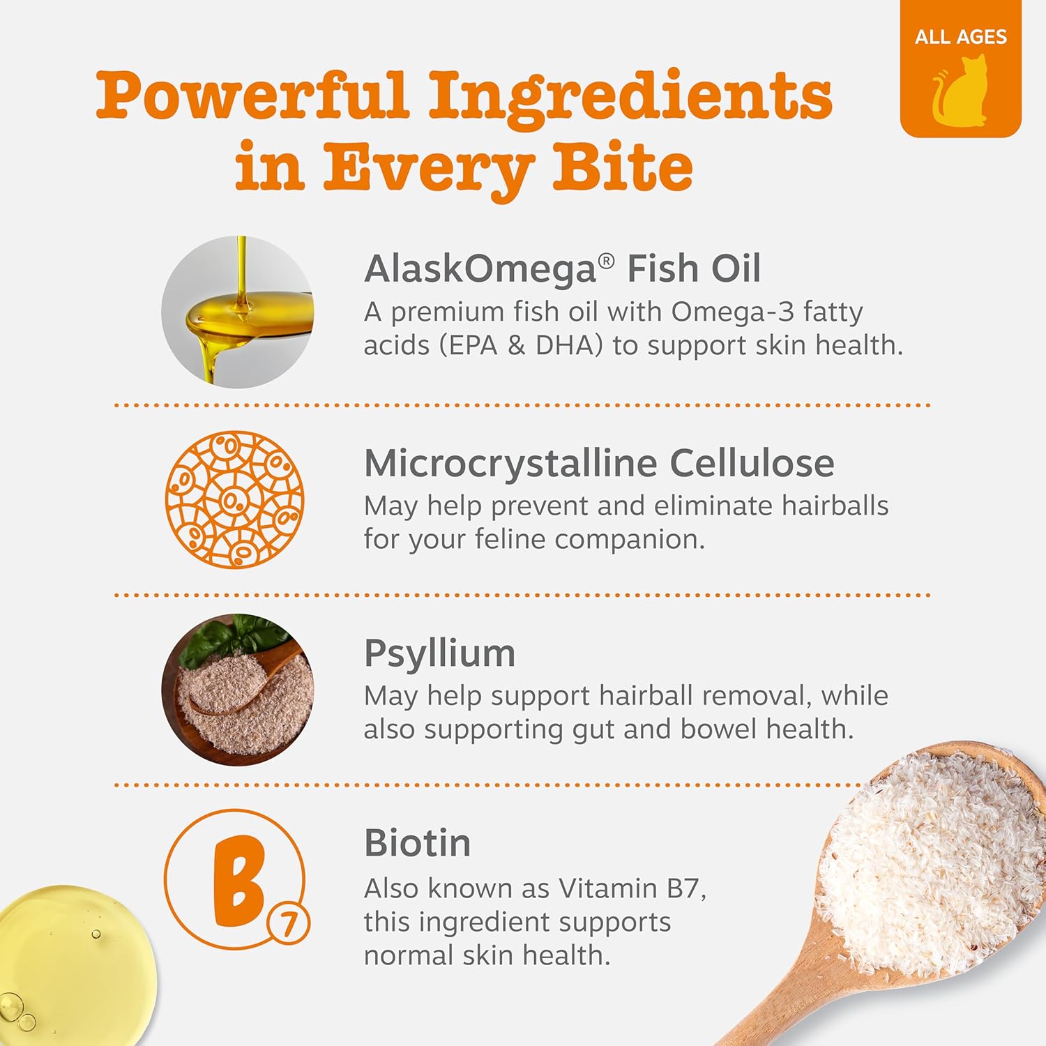 - Promotes Healthy Skin - These supplements also feature Zinc, DHA/EPA, and Biotin so your kitty can maintain their skin moisture content.