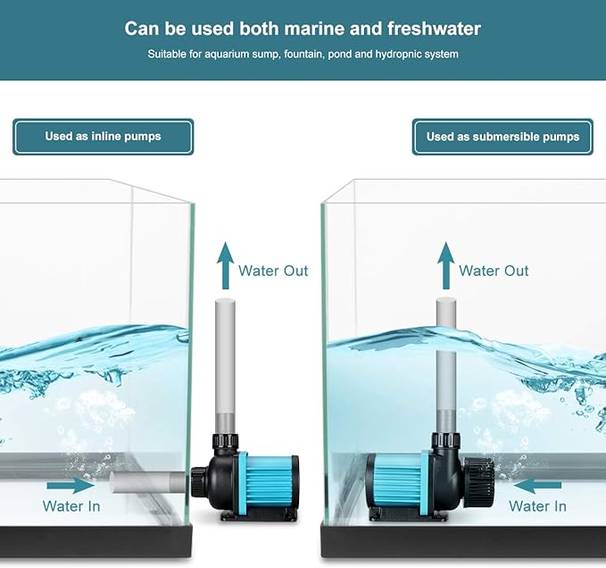 - Wide applicaion DC pump: can be used as salt water or fresh water aquarium sump pump, fountain pump,hydroponics pump and waterfall pump;can be used as external/inline or sumbersible pump;