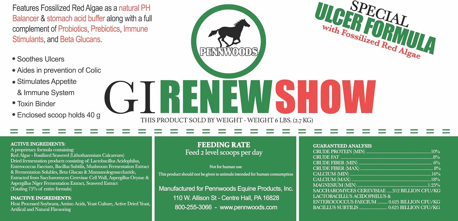 - GI Renew Show is a product specifically designed for horses with ulcers. We have combined the base of GI Renew with a powerful PH Balancer, Fossilized Red Algae. Fossilized Red Algae also contains plenty of helpful trace elements. This powerful combination will be your absolute go-to when you need results.