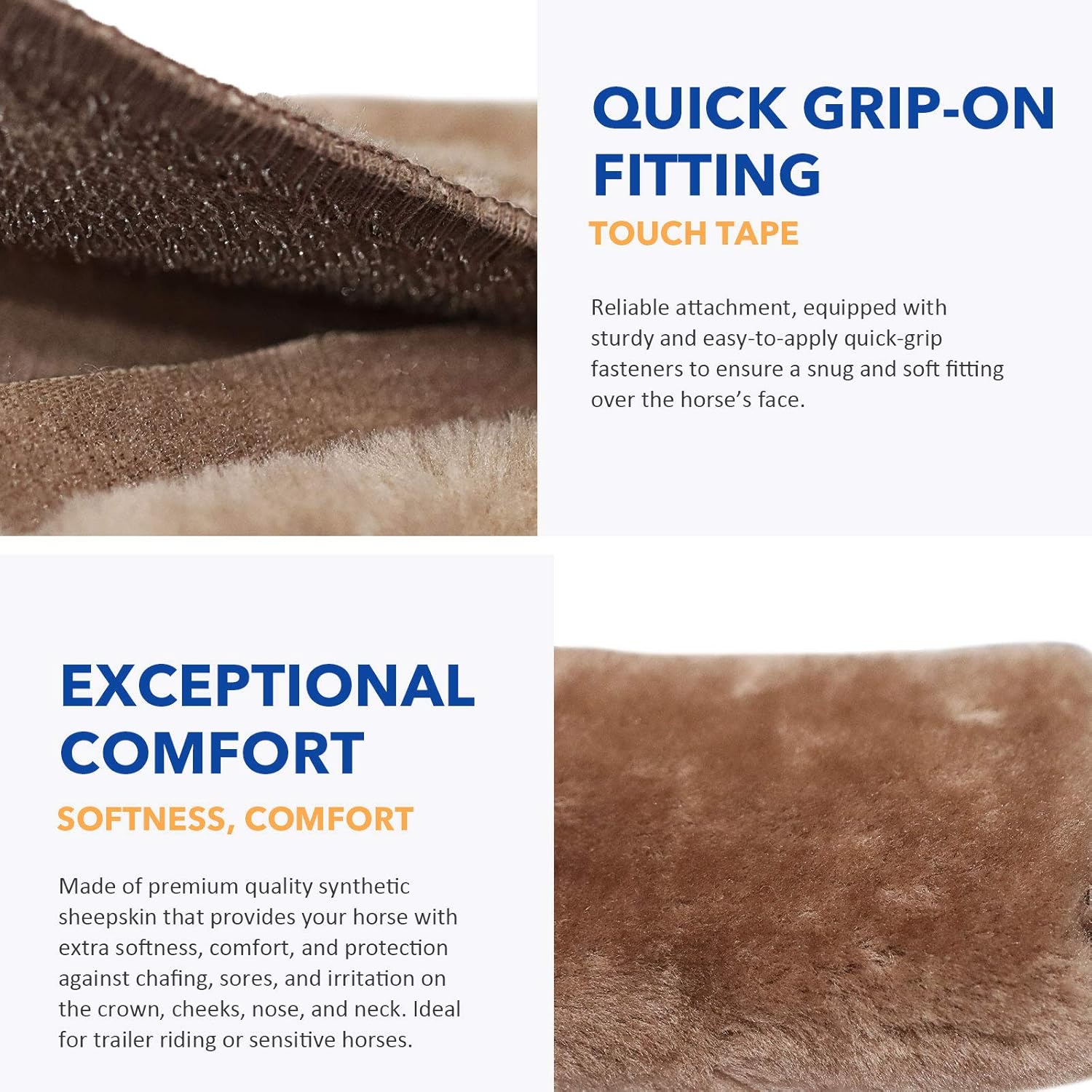 - EXCEPTIONAL COMFORT: Made of premium quality synthetic sheepskin that provides your horse with extra softness, comfort, and protection against chafing, sores, and irritation on the crown, cheeks, nose, and neck. Ideal for trailer riding or sensitive horses.