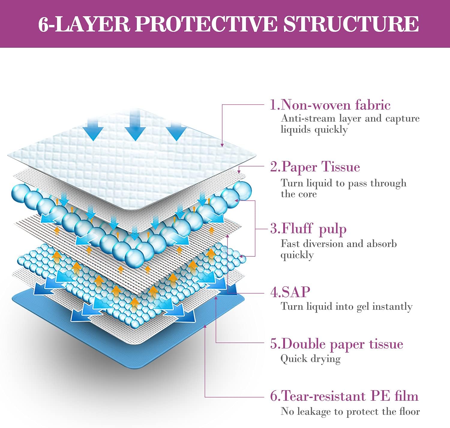 - 【SUPER ABSORBENT & Thicker】Thickened wee wee pads for dogs and 6-layer protection design makes our large dog pee pee pads more absorbent than the most puppy potty pads on the market.