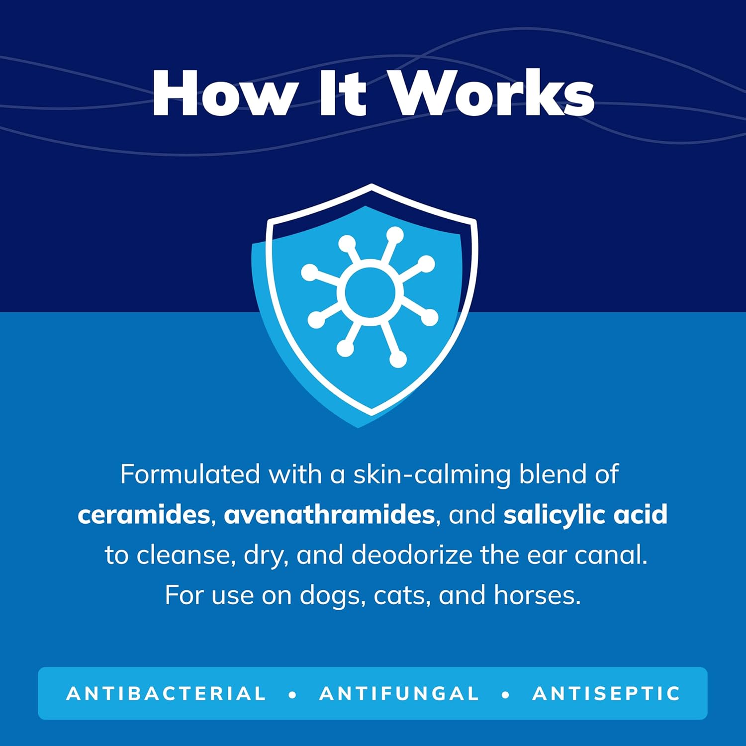 - Ceans, dries, and deodorizes the ear canal