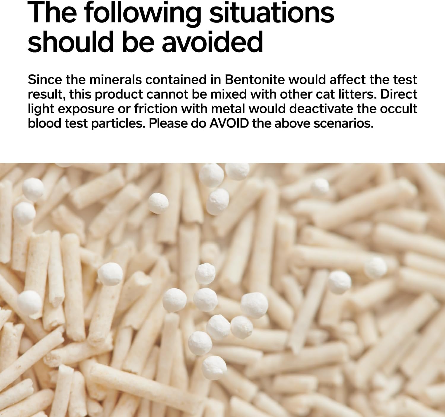 - 【Attention】 1.Direct exposure to hard light or friction with metal would invalid the detection function of the occult blood test particles. Please avoid such situations.2.Mineral substance contained in bentonite would affect the detection performance. Do NOT mix the product with other cat litter. 3.The vacuum design is only to facilitate its transportation and storage, and air leakage does NOT compromise the use. If you DO mind, please contact us.