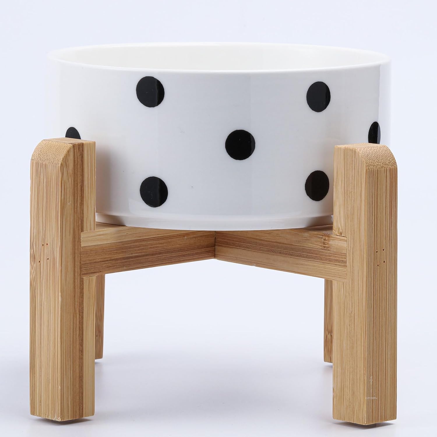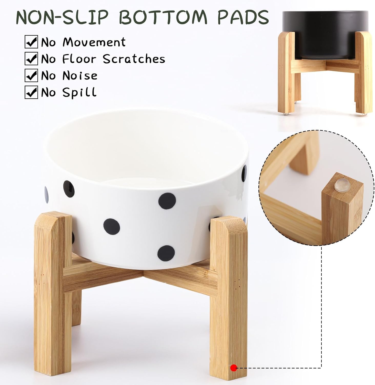- NON SLIP WOOD STAND -You can get two different heights by flipping the bamboo stand,the elevated ceramic medium size pet bowls are perfect for small and medium dogs from different stages of childhood to adulthood, The wood stand on the bowls stopping ceramic dog bowl from sliding around, Keeps pet food and water in the bowls.