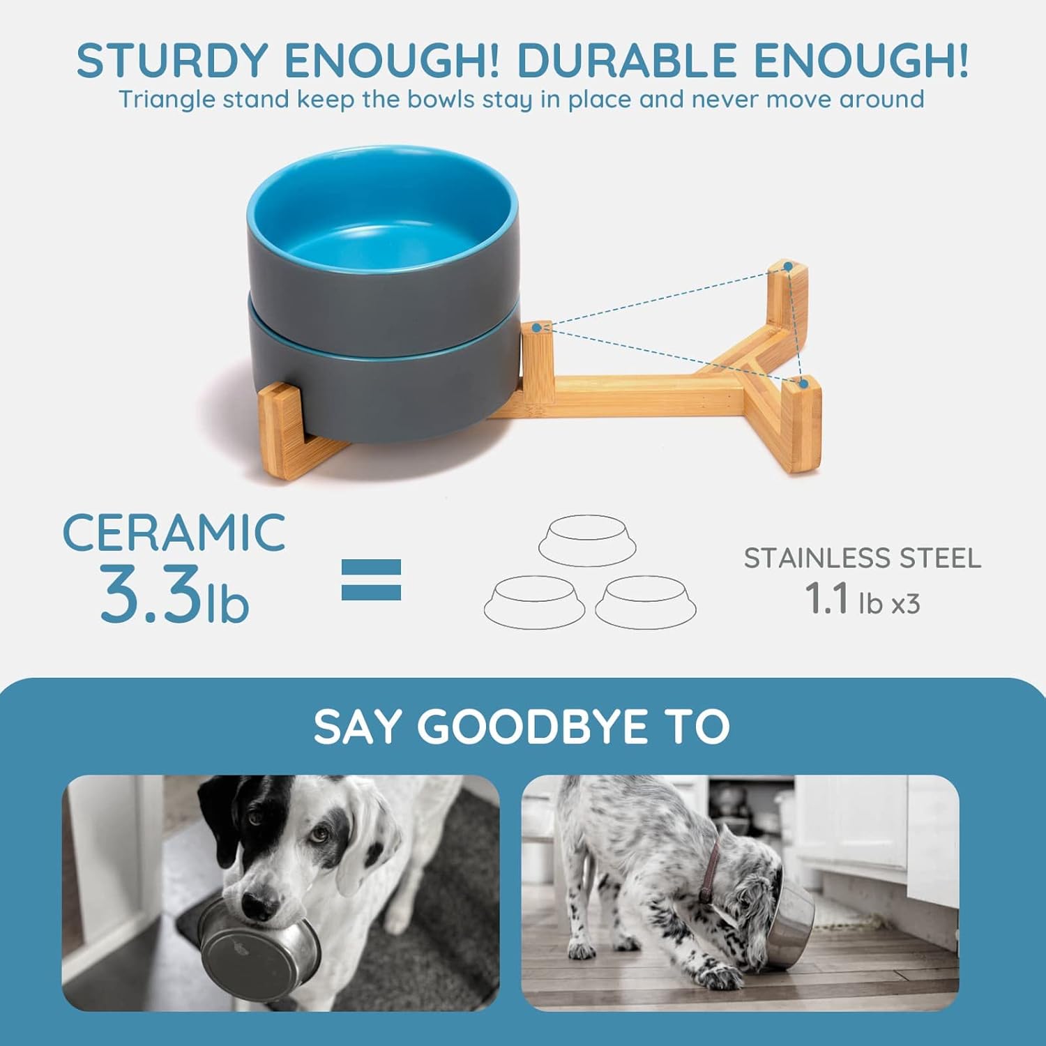SPUNKYJUNKY Ceramic Dog and Cat Bowl Set with Wooden Stand, Modern Cute Weighted Food Water Set for Small Size Dogs (13.5OZ) & Medium Sized Dogs (28.7OZ) & Cats (1.7 Cups, 2 × Blue-Grey)