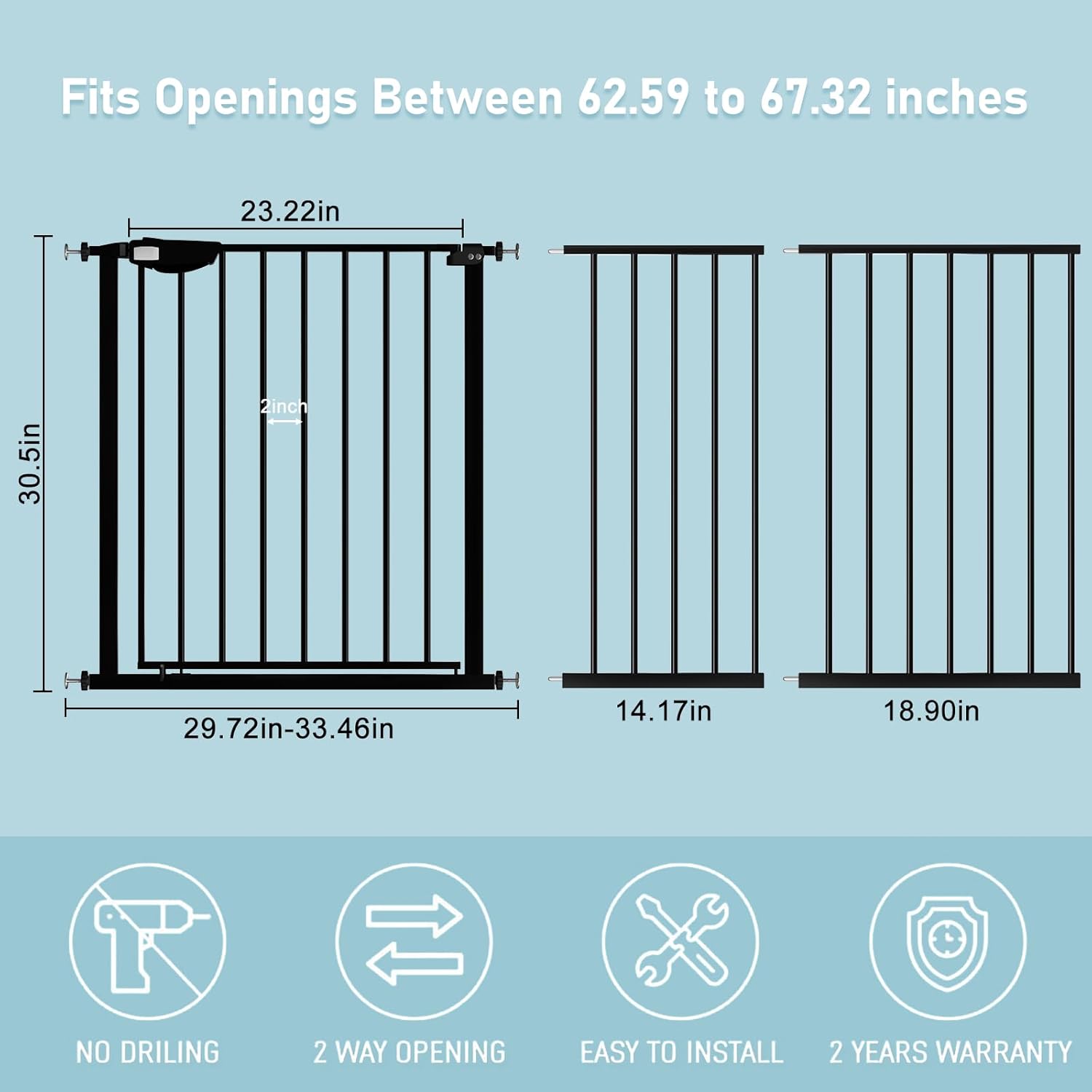 WAOWAO Triple Lock Baby Gate Extra Wide 62.59-67.32" Pressure Mounted Walk Through Swing Auto Close Safety Black Metal Dog Pet Puppy Cat for Stairs,Doorways,Kitchen
