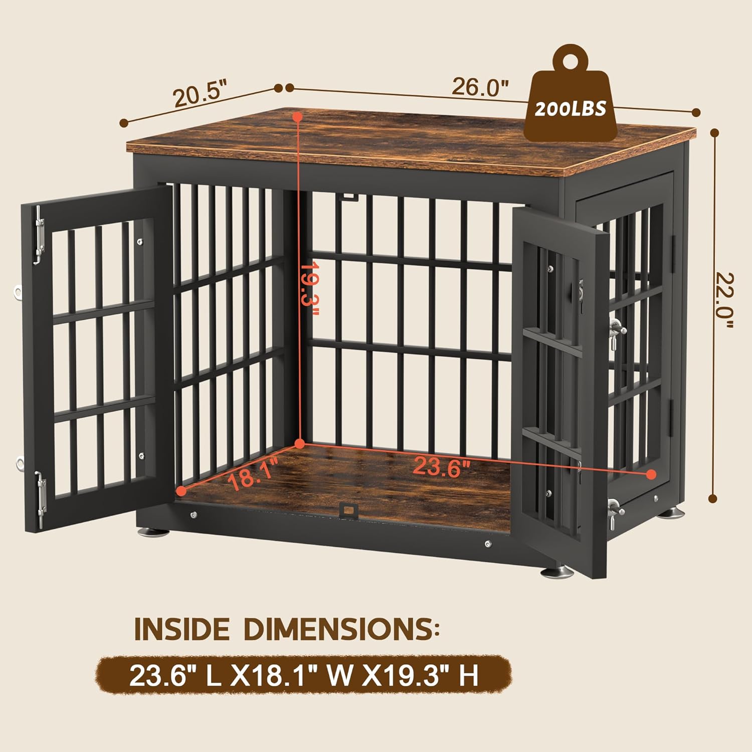- 【Assemble with Ease】 Inside Dimensions: 23.6"L x 18.1"W x 19.3"H, Overall Dimensions: 26.0"L x 20.5"W x 22.0"H. Choosing the right crate size is vital to ensure your dog’s safety and comfort.