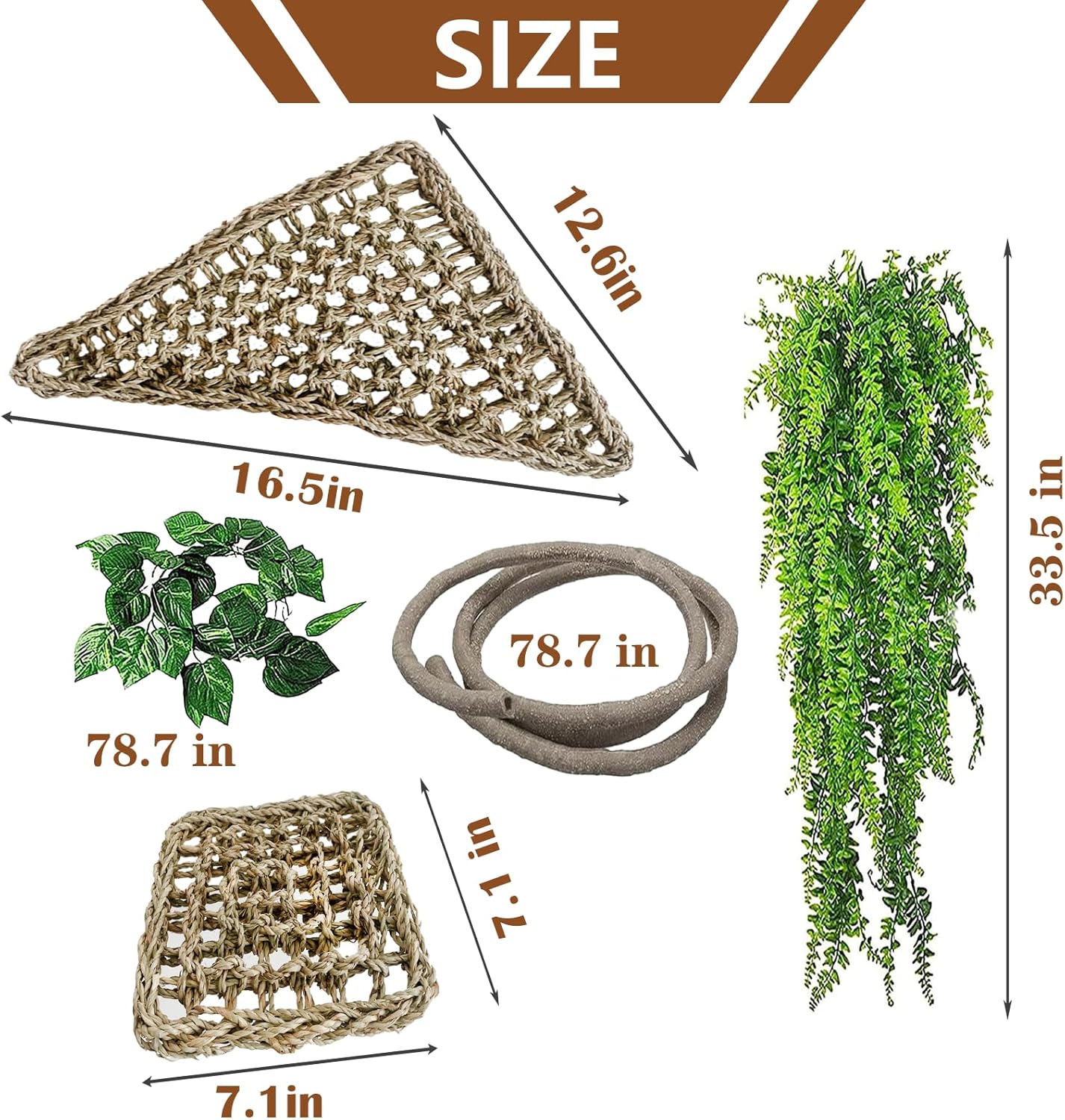 - 【Package Include】1 x Triangle seagrass reptile lizard hammock,1 x Square seagrass bearded dragon lounger,1 x reptile fake vine plants,1 x Reptile vine decoration,1 x Flexible rattan decoration,6 x clasps and 8 x suction cups.bearded dragon lizard hammock and reptile plants play a very good decorative role for your tank