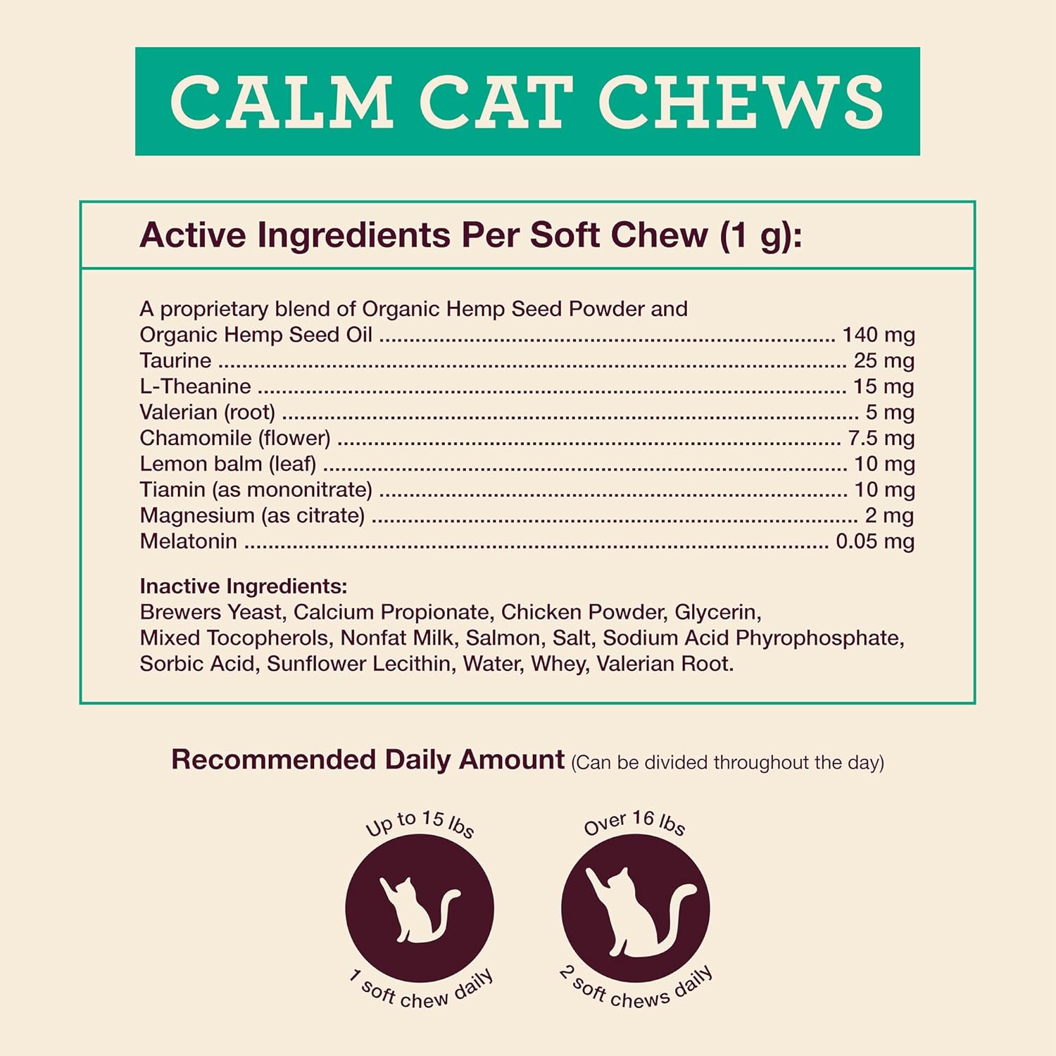 - Formulated to assist with cat hiding, destructive behavior, and cat spraying. This 60-count pack of Hemp Well Calm Cat Soft Chews - a natural and organic option for cat stress. Easy to administer.