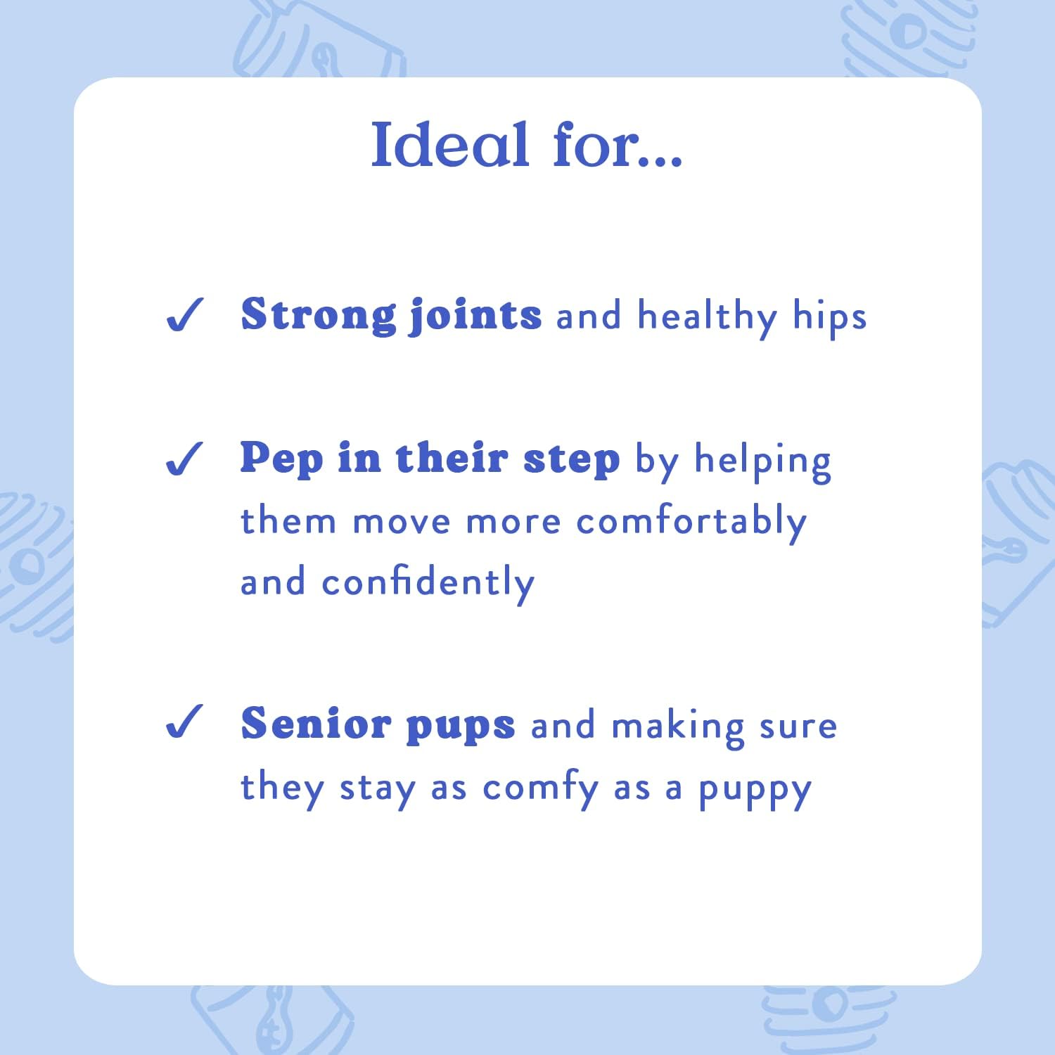 - Let’s keep the pep in your pup’s step! An advanced (... and extra tasty!) formula to help your dog move more comfortably and confidently – without the artificial flavors.