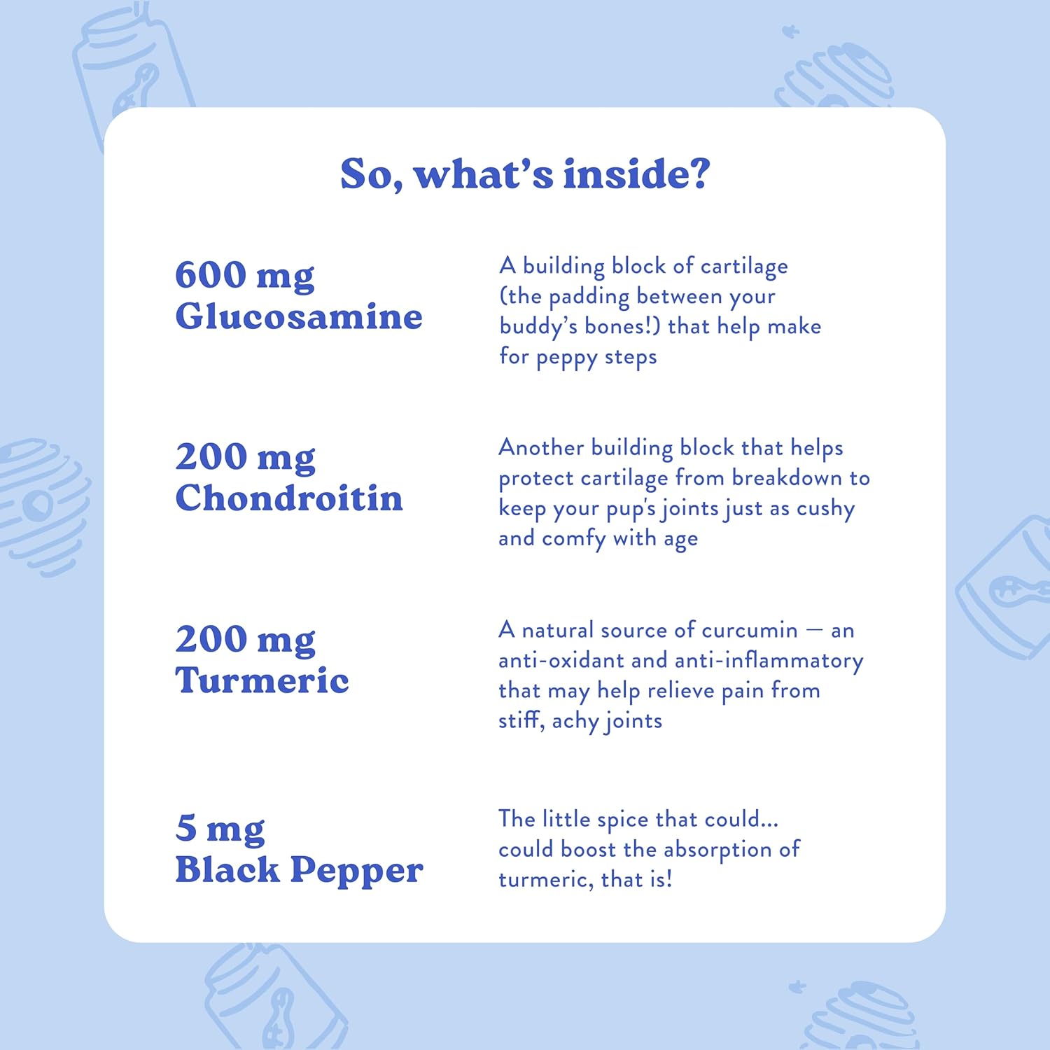 - Simple, Functional, Fun: With Glucosmine, MSM, and Chondrotin all packed into our trustworthy "B" shaped soft chews. Ohand they taste good, too!