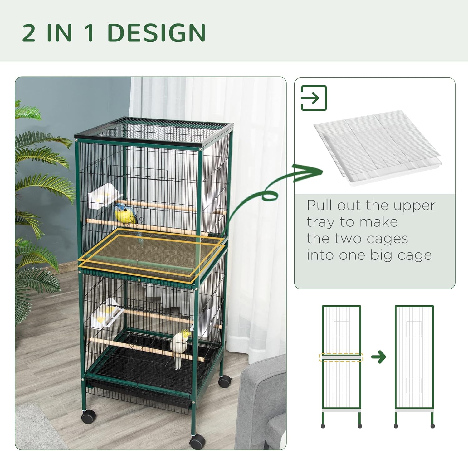 - Large Space: Birds need space not just in height but in width, and 1.7 ft. distance from left to right gives this large bird aviary a grand size in interior space, ensuring comfortable pets. The width lets them fully flap and extend their wings with extra additional space. Each cage contains two wooden perches and two plastic food containers for multiple animals. Pull out the upper tray to make the two cages into a big cage.