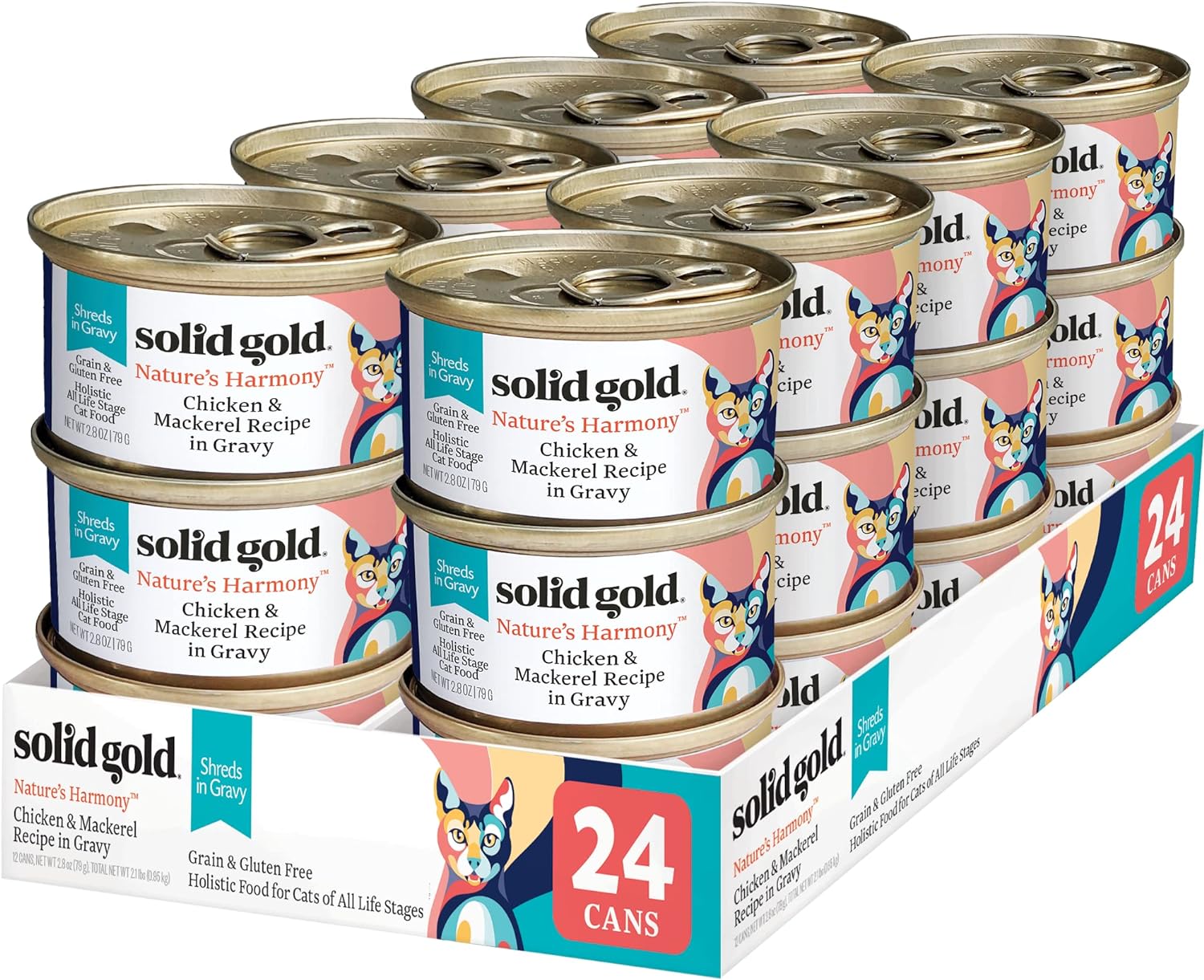 Solid Gold Wet Cat Food Shreds in Gravy - Healthy Canned Cat Food Made w/Real Chicken & Mackerel Shreds, Vitamins & Minerals - Grain Free & Gluten Free Canned Meals for Cats & Kittens - 24ct/3oz Can