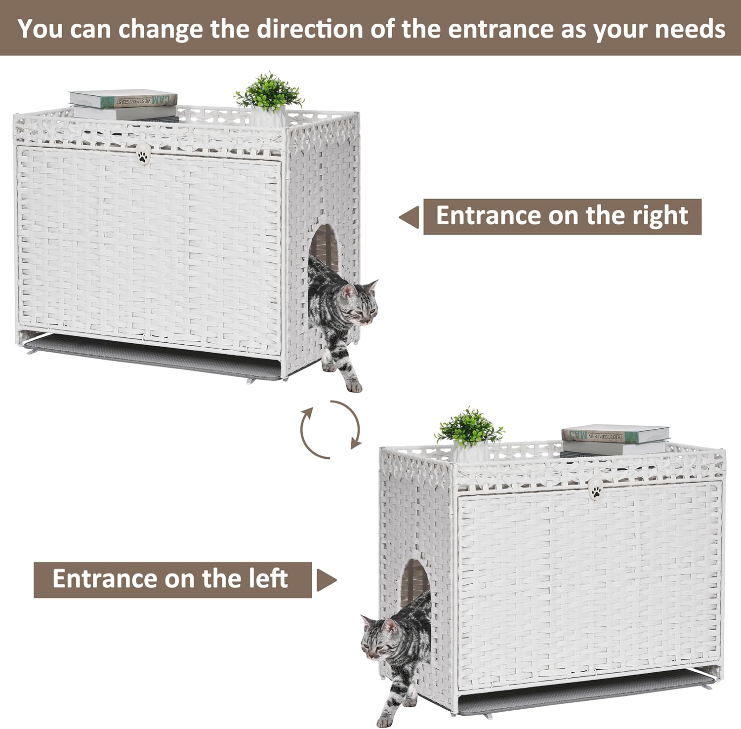 Cat Litter Box Enclosure with Soft Litter Mat; Hidden Cat Washroom Furniture with Door; Handwoven Rattan Cat House with Large Space; Pet Crate for Living Room, Bedroom, Balcony (White)