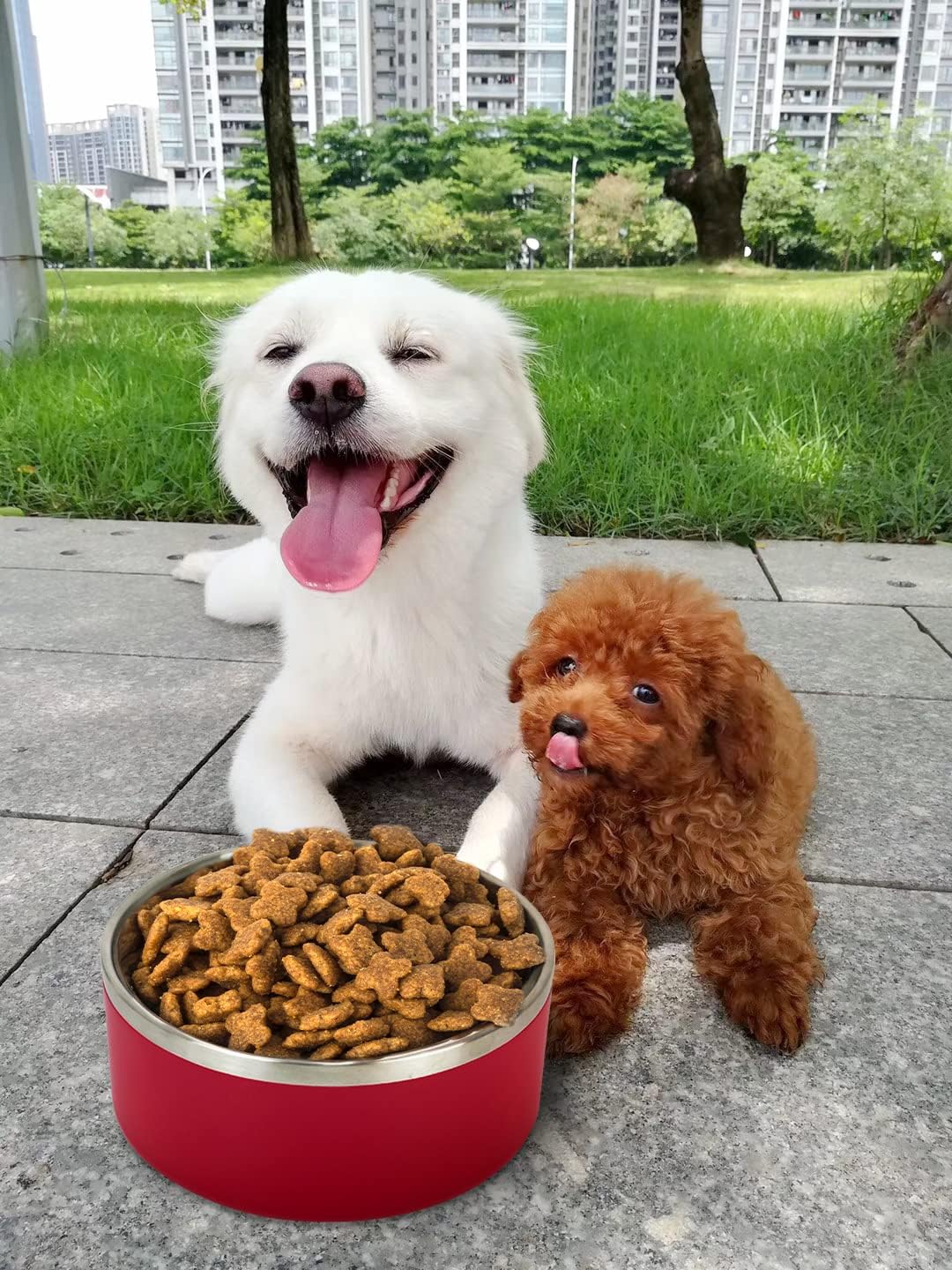 - STAINLESS STEEL DOG BOWLS-Our food and water bowls for dogs are made of double wall insulation and 304 food grade stainless steel, which is super long lasting, rustproof, scratchproof, environmental friendly. The outside of our non-slip dog bowls are made of Acrylonitrile Butadiene Styrene (ABS) for more durability.