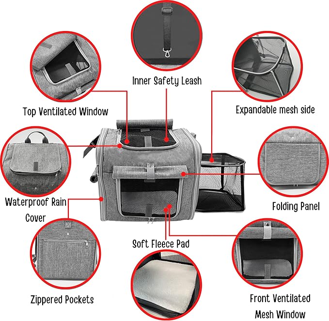 - EXPANDABLE SIDE: The dog bicycle basket expands to create extra room in our spacious pet bag for your cats or dogs to stay comfortable and sprawl out, The left side pocket can be used to store folding dog bowls, toys, snacks, poop bags, etc.