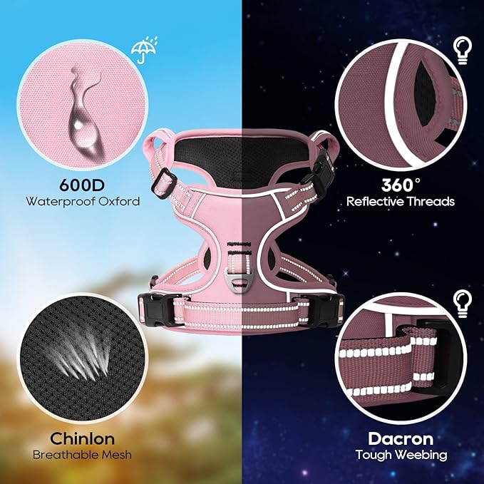- 【MUCH SAFER & MORE COMFORTABLE】 Breathable mesh lining with soft sponge padding plate of puppy harness prevents injuries, giving extra comfort and protection with enhanced 1600D oxford fabric. The reflective material will be really nice when it gets dark. Also, your dog will be saw easily. This reflective material can make drivers have long time to react, which ensure your dog’s safety!