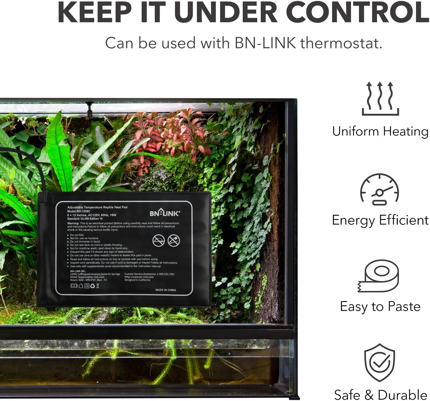 - GREAT UTILITY: The BN-LINK Heating Pad for Reptiles is great for keeping your reptile tank warm, but never scorched. It’s also great for amphibian, small animal, or plant terrariums.