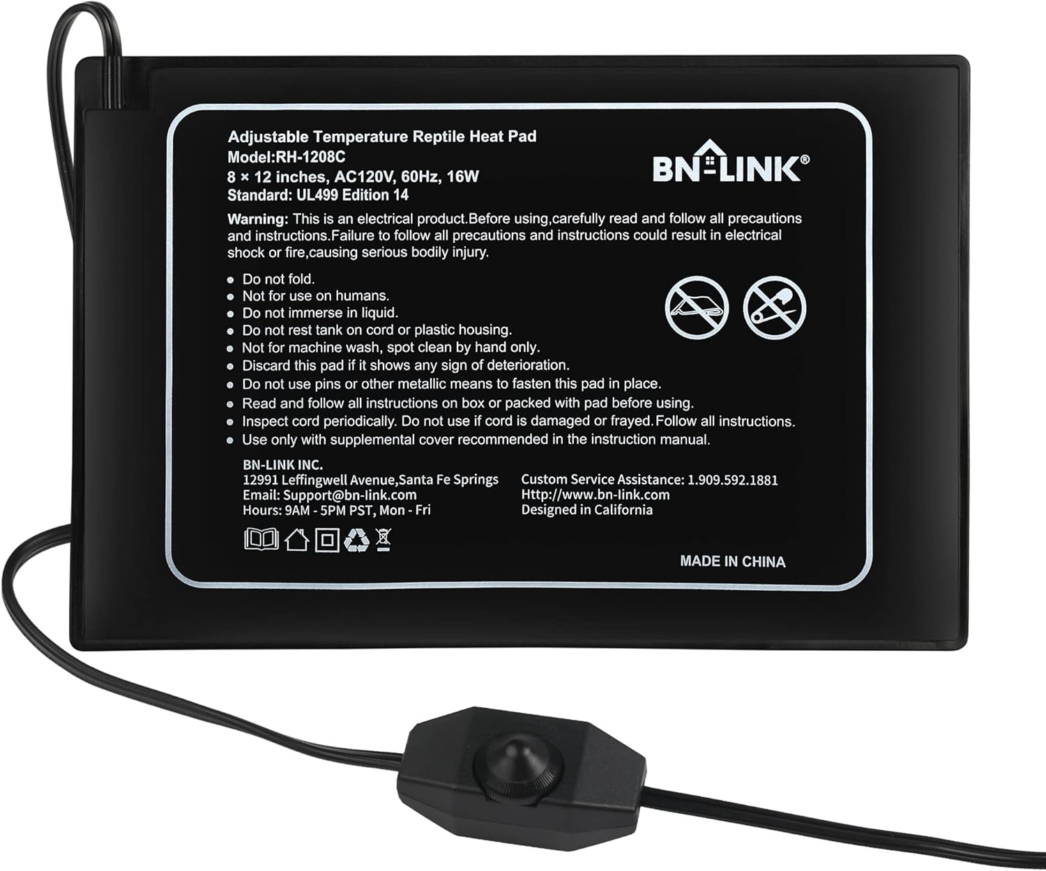 - MADE FOR REPTILES: Voltage: 120 volt, Power: 16 watt. The 8" x 12" model is perfect for a 10 -20 gallon terrarium and it can easily put out steady heat between 104℉ and 122℉. Each unit comes with BN-LINK’s strong 15-month warranty.