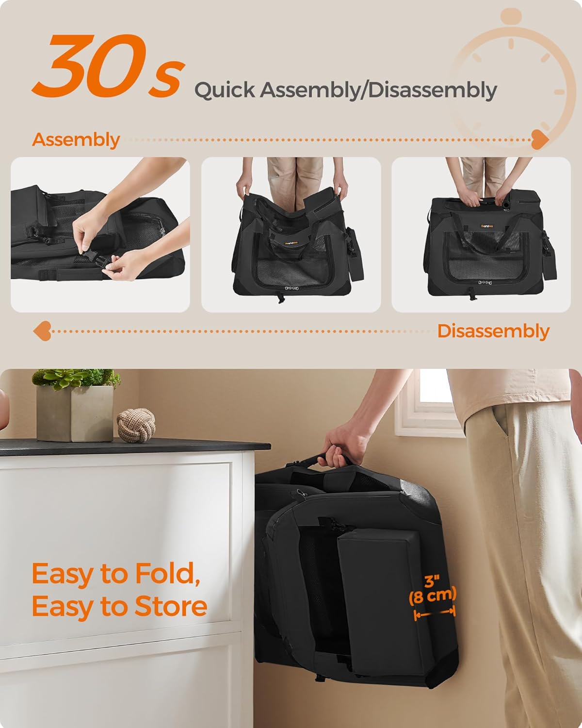 - 【QUICK ASSEMBLY & EASY FOLDING】The dog crate can be assembled in 30 seconds without tools and can be stored in the car or in the corner of your home after folding. It can be easily carried for indoor use or traveling, giving your dog a warm home anytime
