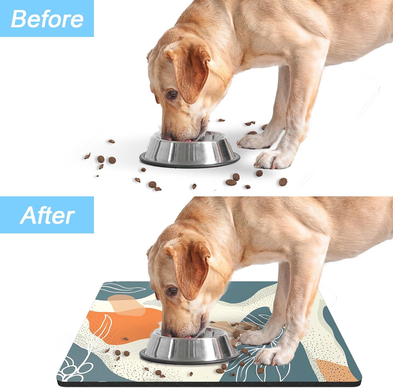 - Super Absorbent Placemat: Aesthetic dog food mat surface is made of absorbent suede with soft, anti-fray which can quickly absorb liquid and wet food stains to prevent prevents food & water from spilling onto floor