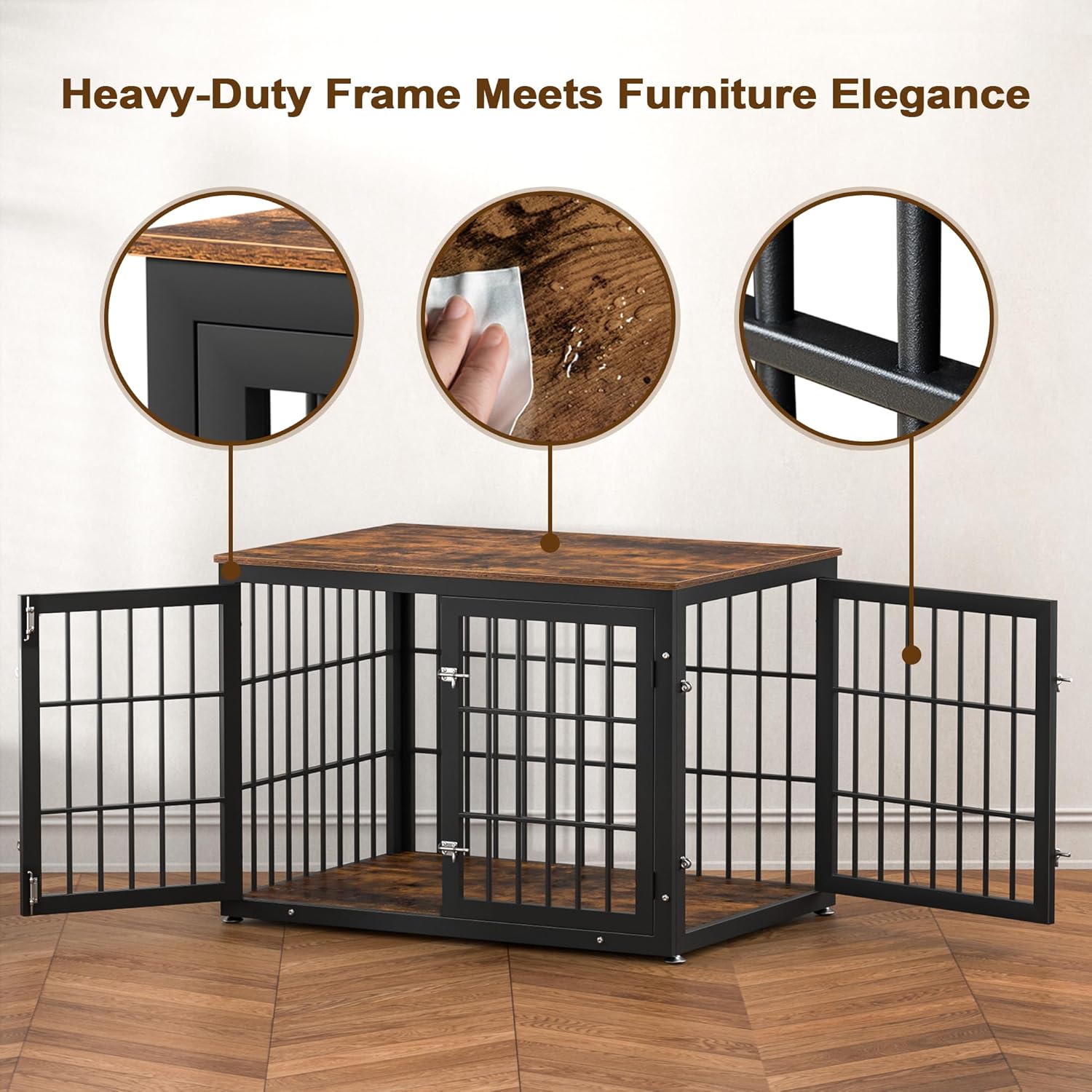 - 【Ventilation& Easy to Clean】 The dog kennel is surrounded by round bars, which provide good air circulation and visibility. Dogs can be very messy and can sometimes have accidents, just open the front doors or side door and clean it with a cloth.
