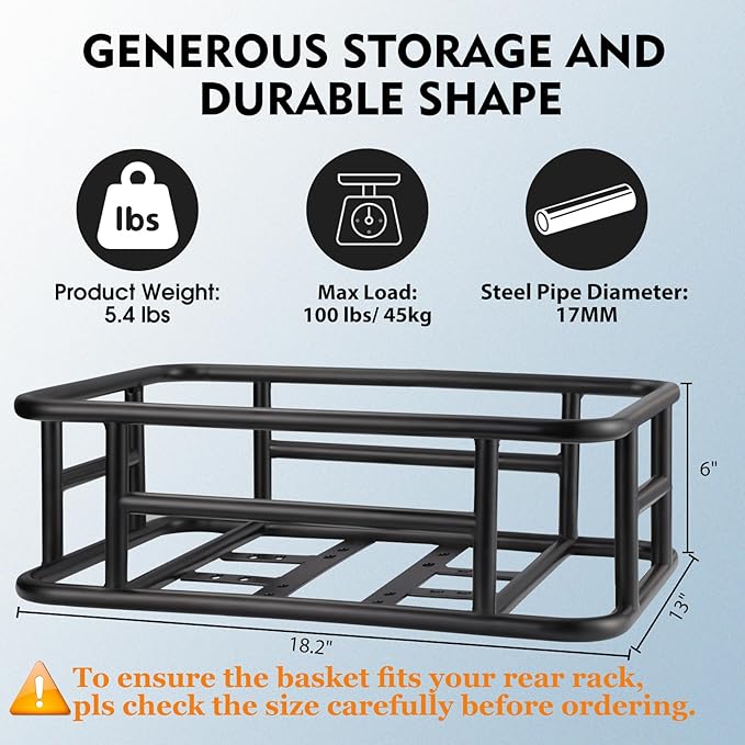 - ๐ฆ๐๐ฝ๐ฒ๐ฟ ๐๐ฎ๐ฟ๐ด๐ฒ ๐ฆ๐ฝ๐ฎ๐ฐ๐ฒ: The dimension of the basket is 18.2 x 13 x 6 inches, which can support a weight of 100lbs. Perfect for carrying backpacks๏ผpets๏ผdaily shopping, or as a delivery bike basket.