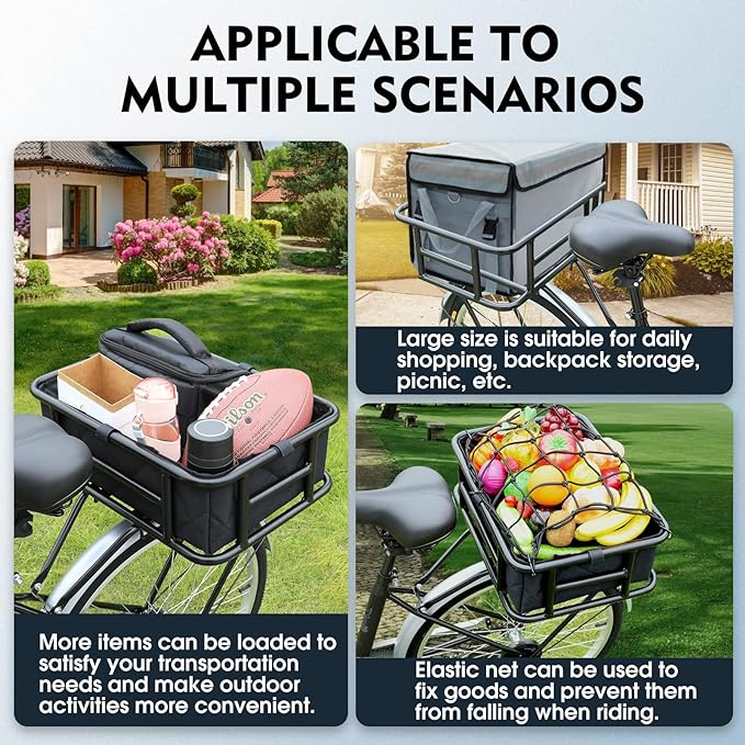 RAYMACE Rear Rack Bike Basket with Cargo Net and Liner Large Bicycle Basket Perfect Mount for Electric Bike