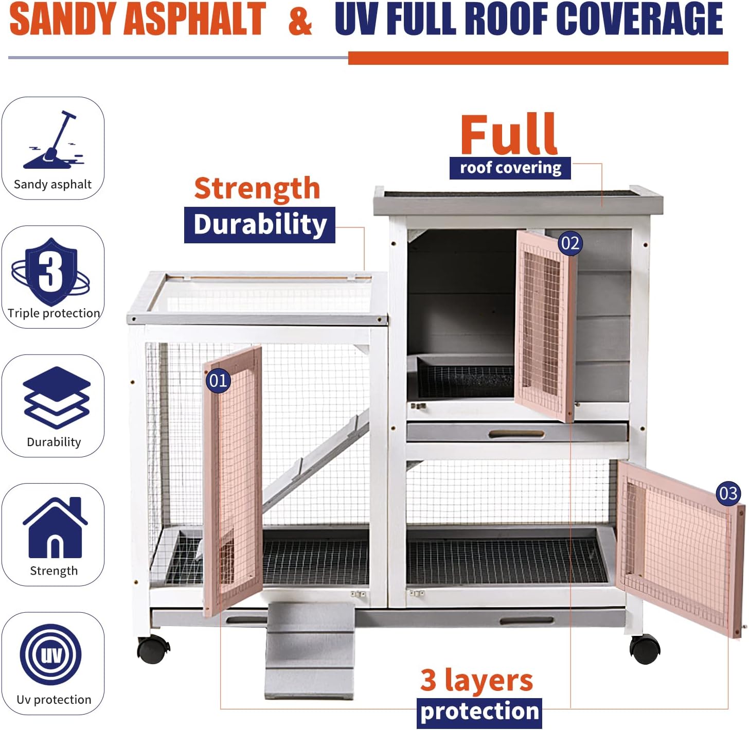 - Comfortable and safe rabbit hutch -- The rabbit hutch is made of environmentally friendly waterproof and non-toxic varnish, while the cedar wood construction is pet-friendly and weather-resistant, and the asphalt roof will effectively protect the small pets inside from wind/rain/snowy weather. Suitable for both indoor and outdoor environments.