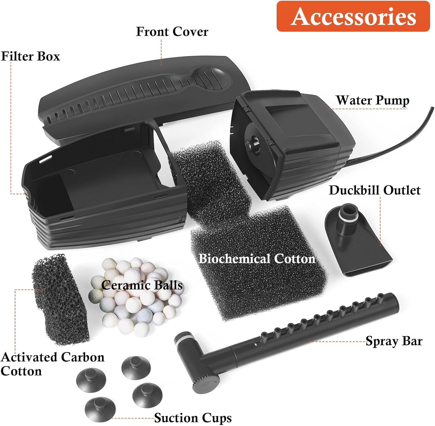 - 【3 Filter Media, 4 Filter Procedures】This fish tank filter has three kinds of filter media: 1pc Activated Carbon Cotton, 2pcs Biochemical Cotton and Ceramic Balls. After the water goes through the filter, it goes through four filter procedures to be completely filtered, then sprays out from the outlet.