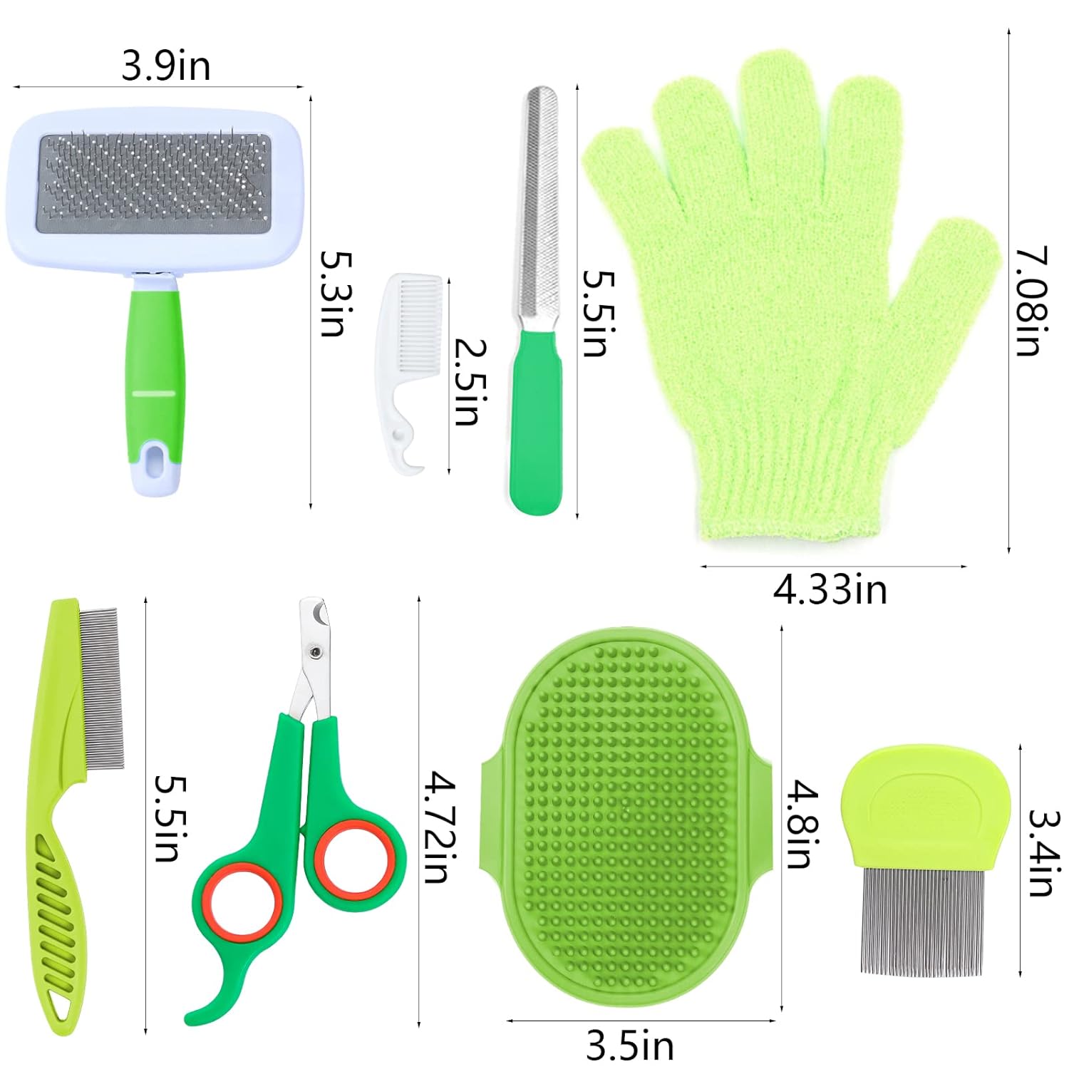 - 【8 Pieces Pet Grooming Kit】 The set contains pet nail clipper and file, flea comb*2, pet shampoo bath brush , pet shedding slicker brush, bath massage glove, small cleaning comb.