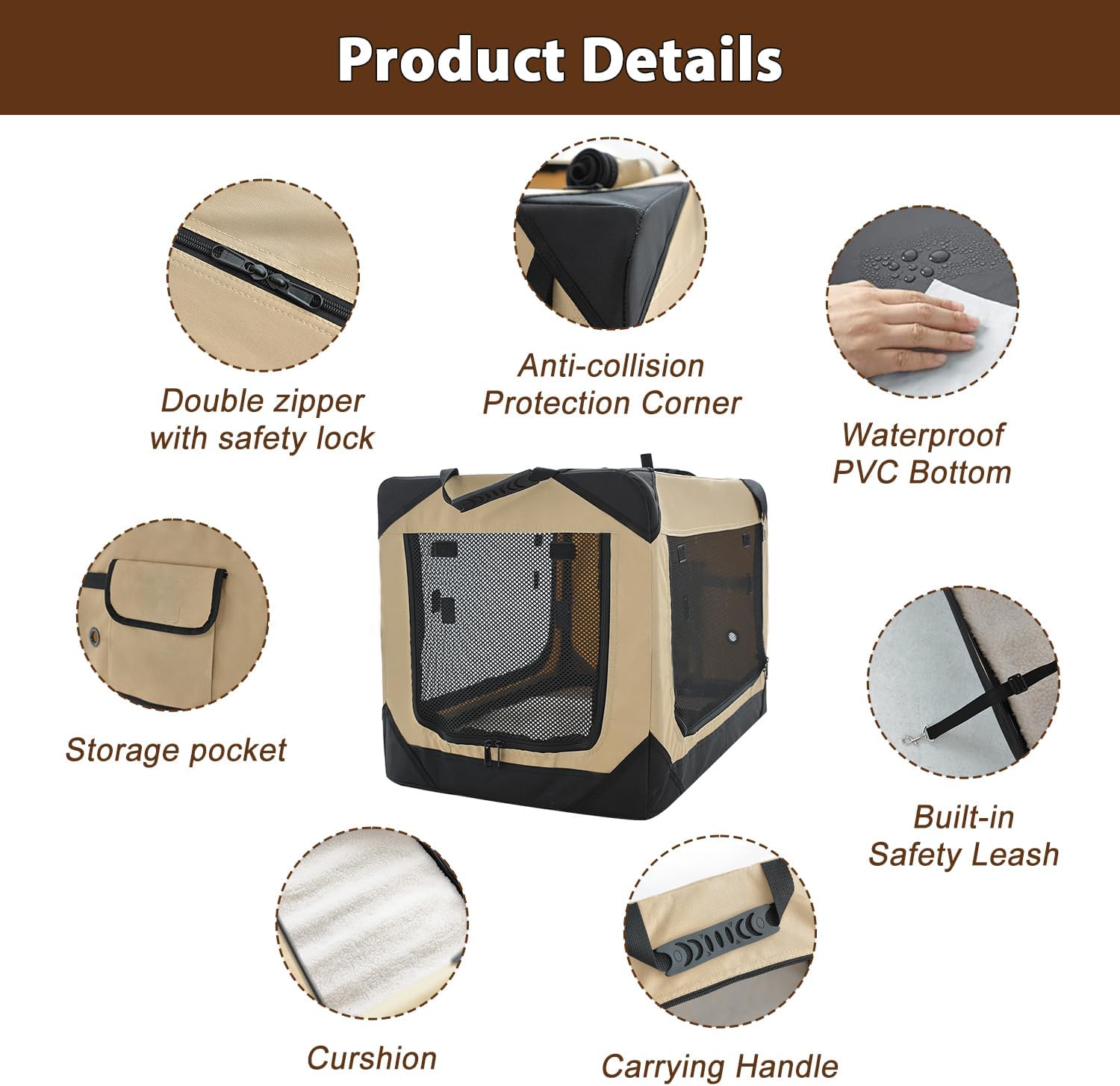 36 Inch Collapsible Soft Dog Crate for Large Dogs, 4-Door Foldable Travel Dog Kennel with Durable Mesh Windows for Indoor & Outdoor Portable Pet Crate, Soft Side Dog Crate, Beige