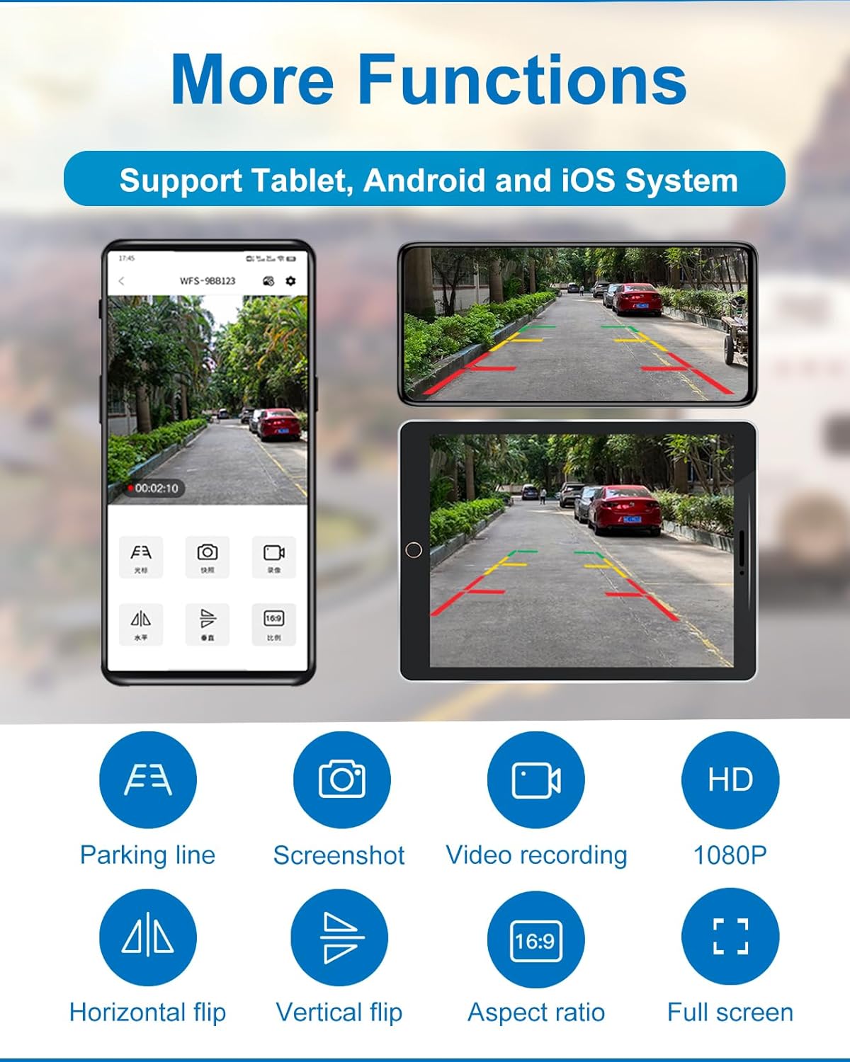 - 【Full HD Image Quality, IR Night Vision】With 1080P HD color CMOS sensor, 1920*1080 pixel (720P output) and IR-Cut module, the camera provides you with high-definition and realistic images. Equipped with 4 infrared LEDs, the camera has 17ft/5m night vision distance and offers excellent night vision in pitch-dark environment to make reversing safer