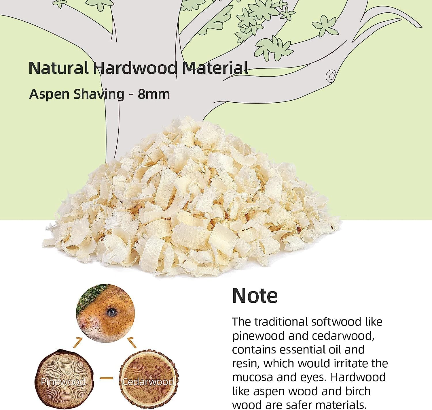 - [Strong Absorption & Easy Clean] The aspen bedding can help absorb annoying smells and soak up moisture really well. It freshens the air of your pets' hideout. They have strong water absorption. With Aspen wood bedding, it is such a time saver. If your pet has a designated spot he or she prefers to do their business, you can scoop that spot and refill that area easily.