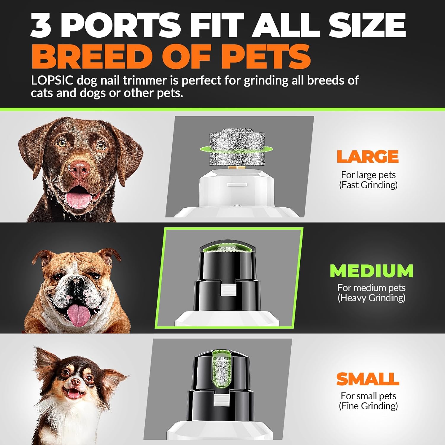 • 【3 Grinding Ports & Rechargeable】: LOPSIC dog nail grinder has 3 grinding ports for grinding different sized pets’ nails, suitable for all types of large,medium, small animal nail care and cat claw care. You can select an appropriate port to trim nails of different thicknesses and lengths. The dog nail trimmers are specially designed rechargeable devices, making it convenient to charge and use this dog nail grinder for dogs anytime and anywhere