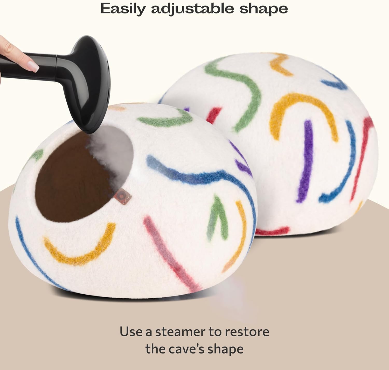 MEOWFIA Cat Cave – Premium Felt Cat Bed for Indoor Cats, Handmade 100% Merino Wool (Medium, Ivory Rainbow)