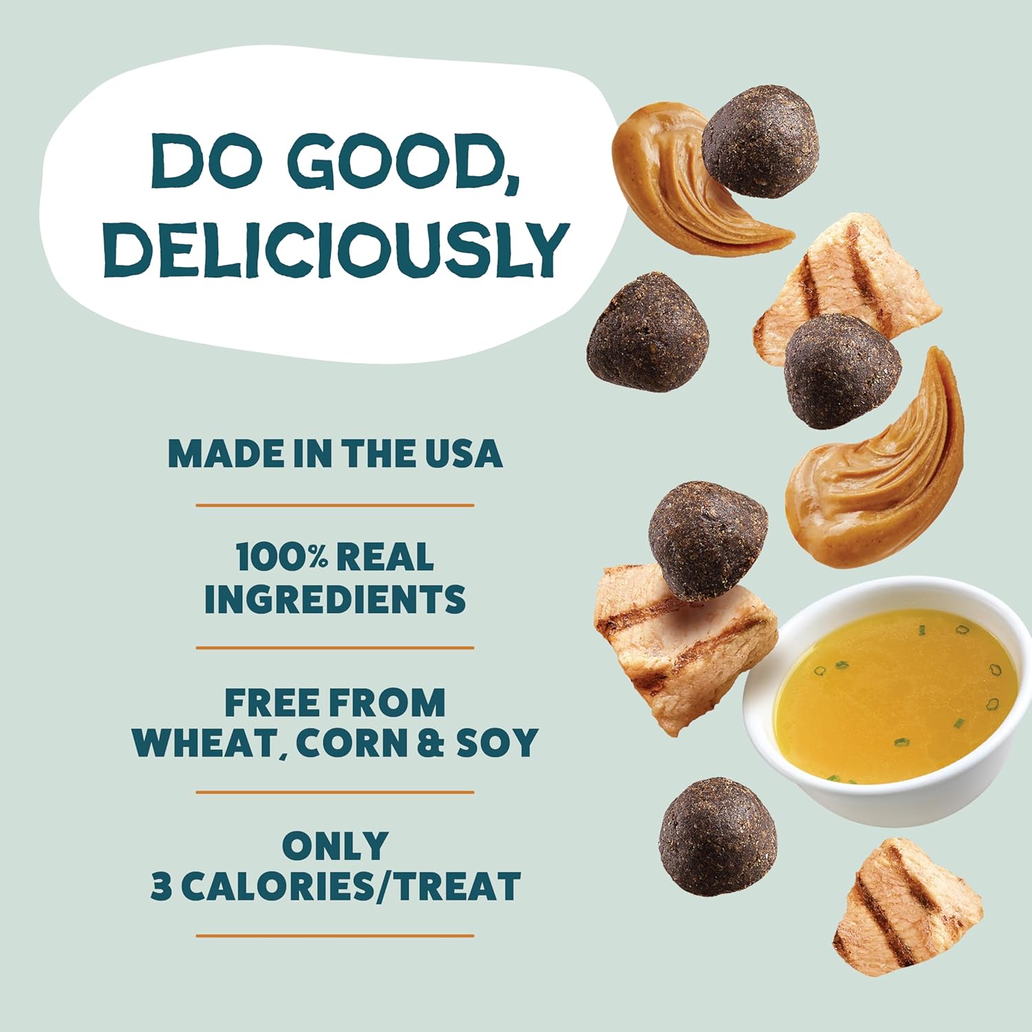 - Whole Ingredients: These high-reward treats are free from corn and soy while loaded with wholesome ingredients like real peanut butter, chicken, and chicken bone broth. At only 3 cal/treat, these are the perfect medium training rewards for your pup throughout the day. Dogs of all ages, sizes, and breeds can enjoy these firm and chewy treats!